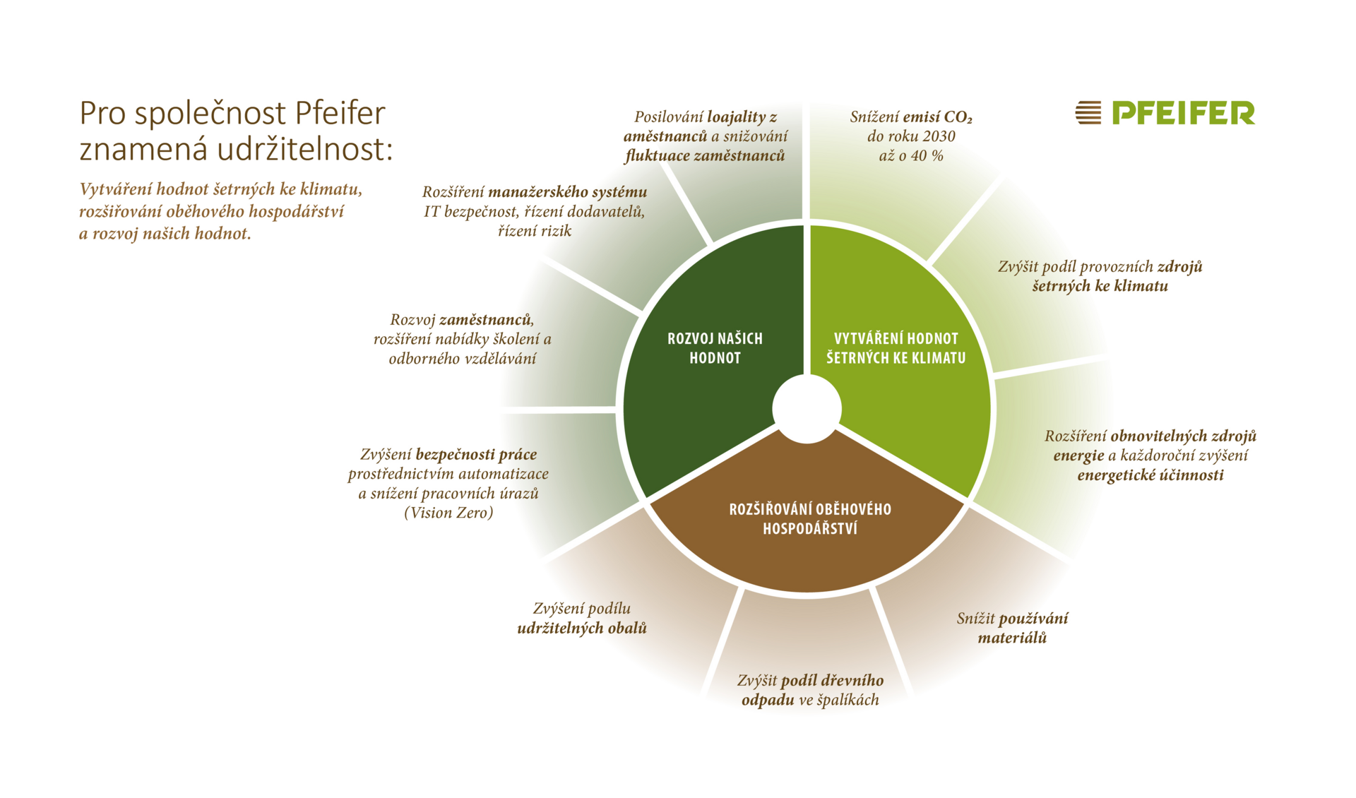 Udržitelnost@Pfeifer v konkrétních velikostech cílů a v cílech do roku 2030 se zaměřením na ekonomické, ekologické a sociální cíle