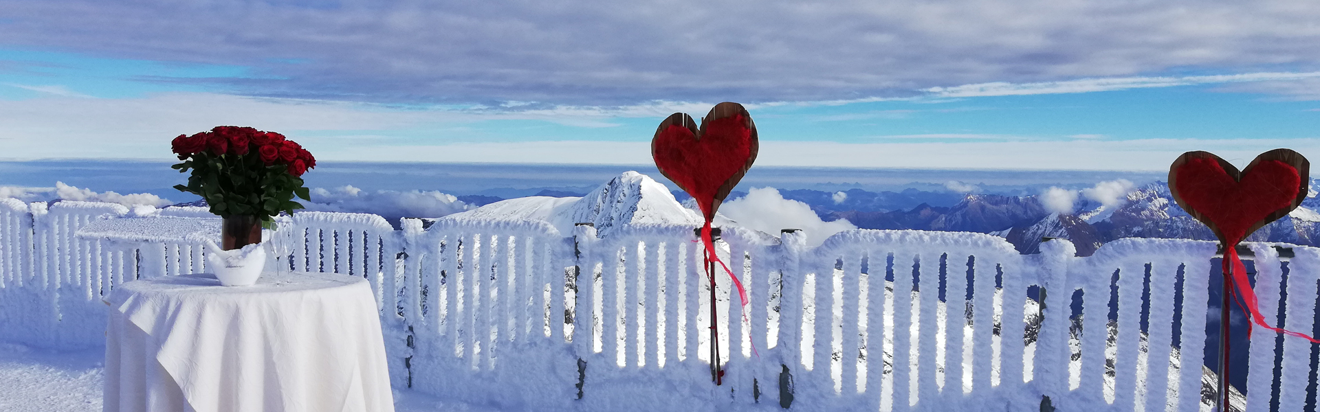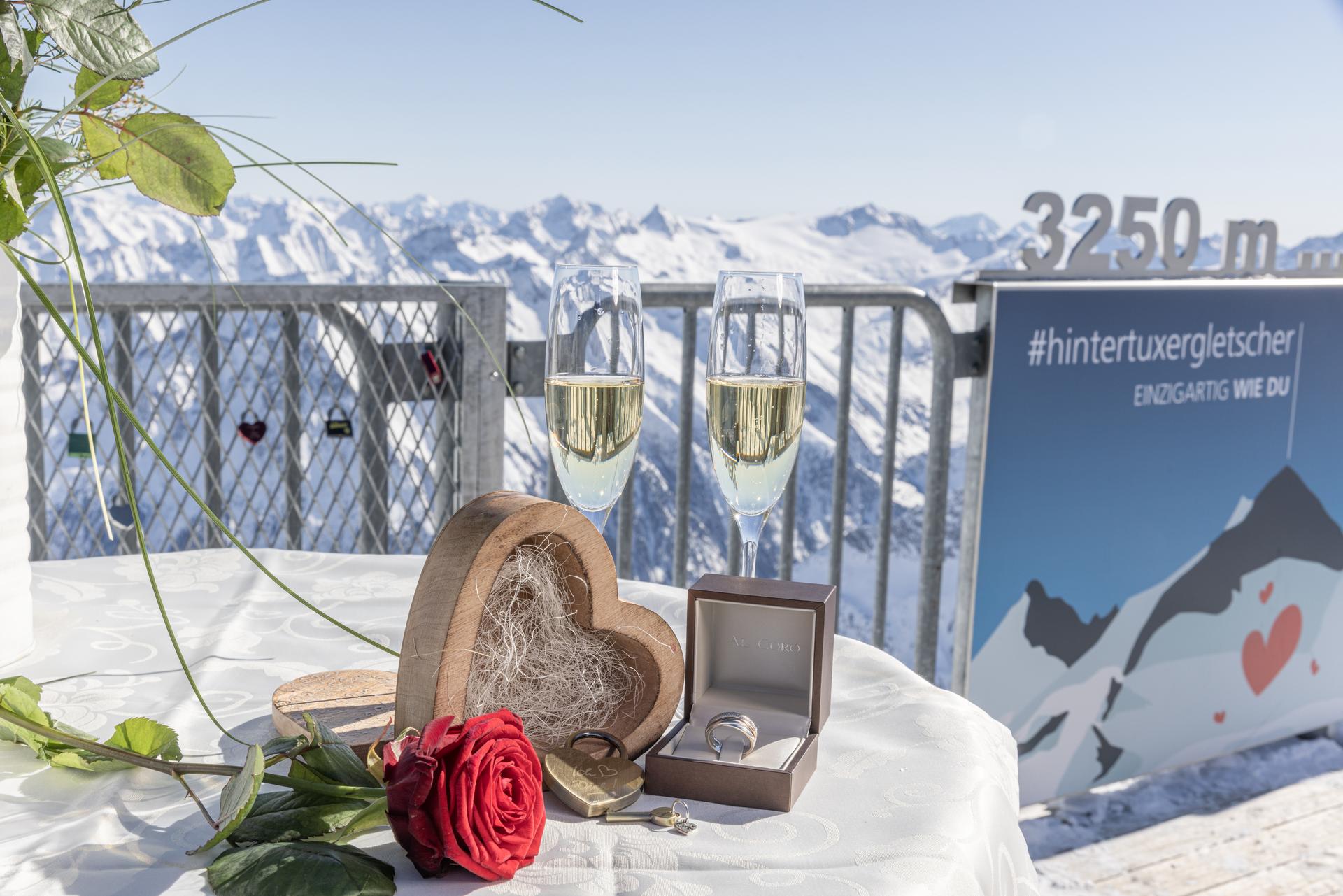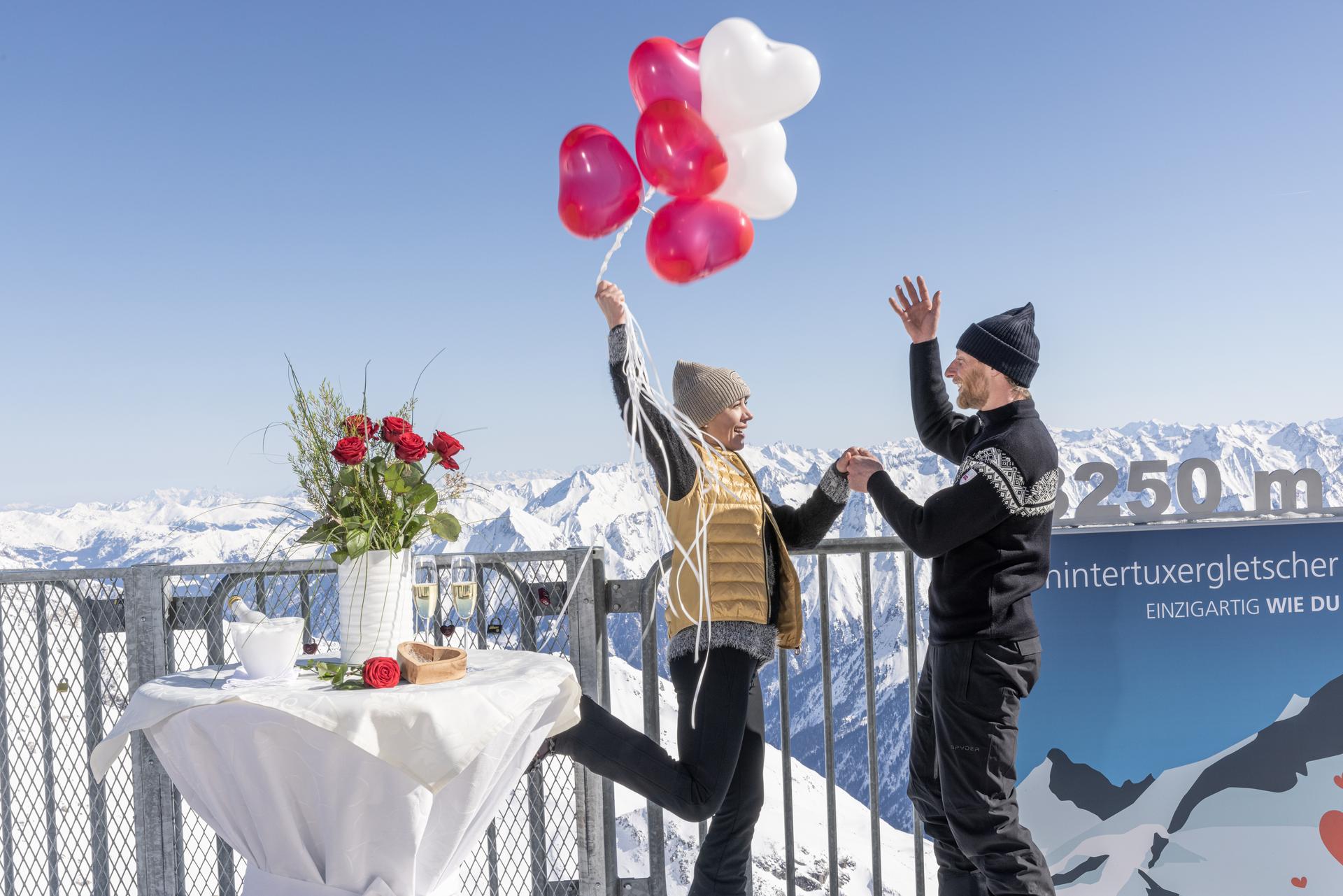 Ob im Rahmen eines romantischen Gondelfrühstücks, im Natur Eis Palast 30 Meter im Gletscherinneren oder inmitten des 5-Sterne-Panoramas auf der Panoramaterrasse auf 3.250 m: Am Hintertuxer Gletscher findest du garantiert die passende Location für den einzigartigen Heiratsantrag!