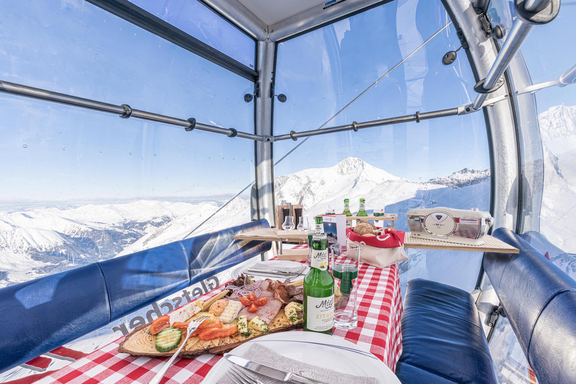 Die Brettljause in der Gondel kann entweder mit regulärem Skipass gemacht werden oder als Fußgänger mit dem Panoramaticket Faszination Eis. Das Panoramaticket Faszination Eis ist auch für den Gletscherbus 3 gültig, womit einer Auffahrt auf die Panoramaterrasse oder zum Natur Eis Palast vor der Jause nichts im Wege steht.