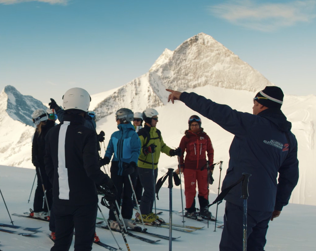 - Angekommen an der Bergstation des Gletscherbus 3 teilen wir uns in Kleingruppen auf und fahren zwei Abfahrten gemeinsam ab. Die Gondelfahrten können dazu genutzt werden, um Fragen zum Skigebiet, zum Gletscher oder zur umliegenden Bergwelt zu stellen.