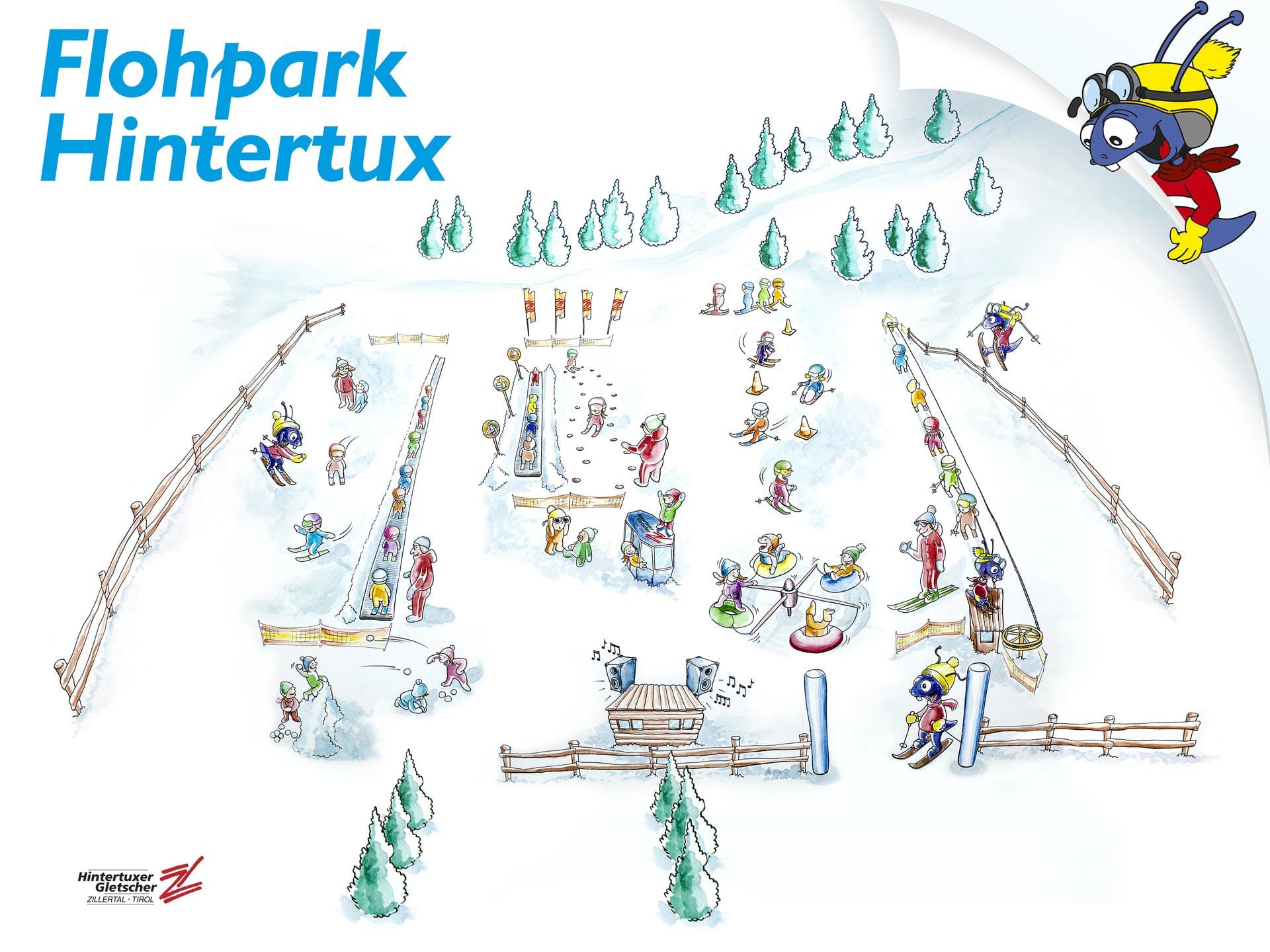 Der Flohpark Hintertux befindet sich in der Nähe des letzten Abschnitts der Talabfahrt Schwarze Pfanne und ist der perfekte Ort um eine vielversprechende Skikarriere zu starten. Dort bekommen Kinder, Anfänger aber auch Wiedereinsteiger ein Gefühl für die Bretter, die die Welt bedeuten. Gletscherfloh Luis unterstützt mit Förderbändern, Anfängerliften und einem Karussell!