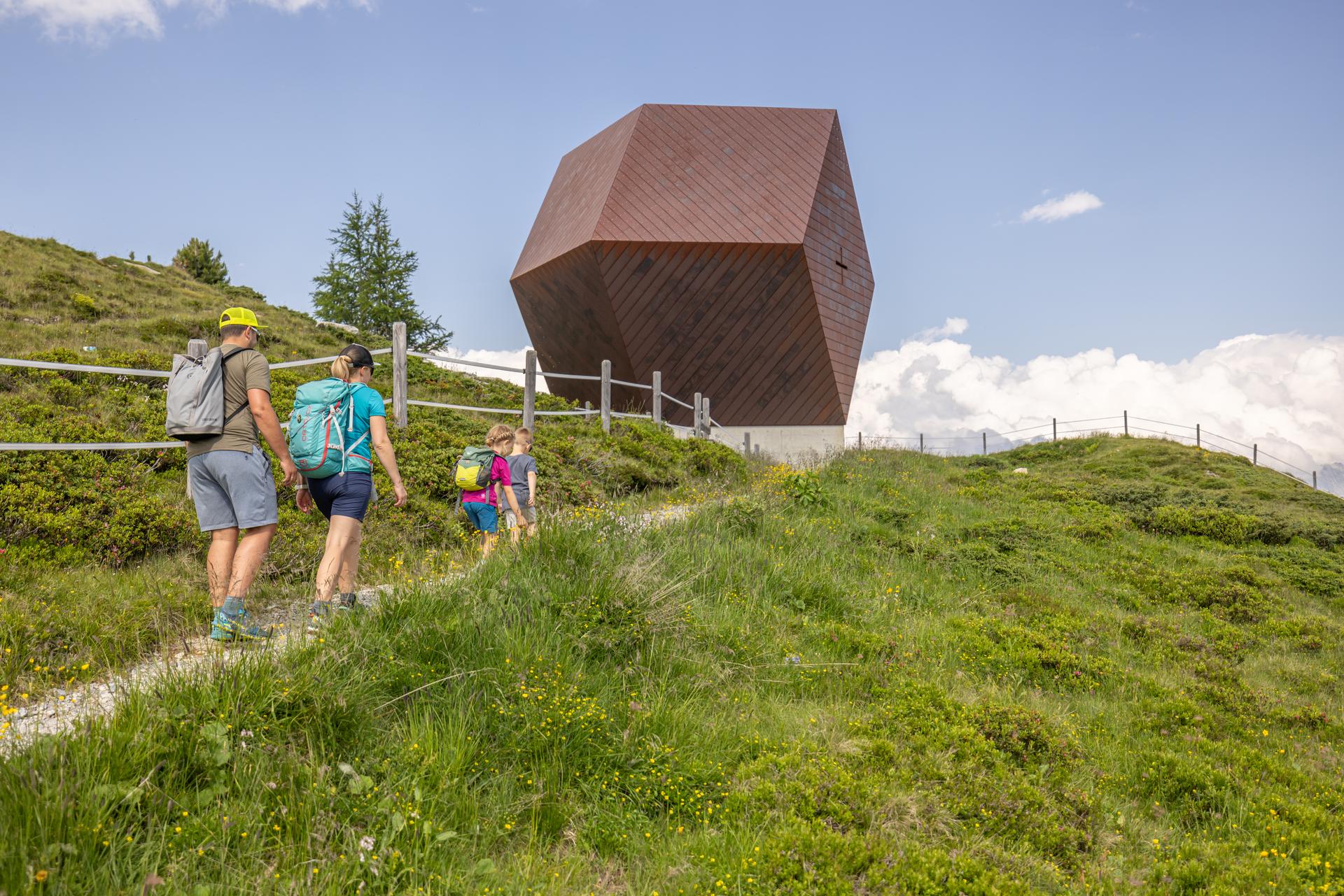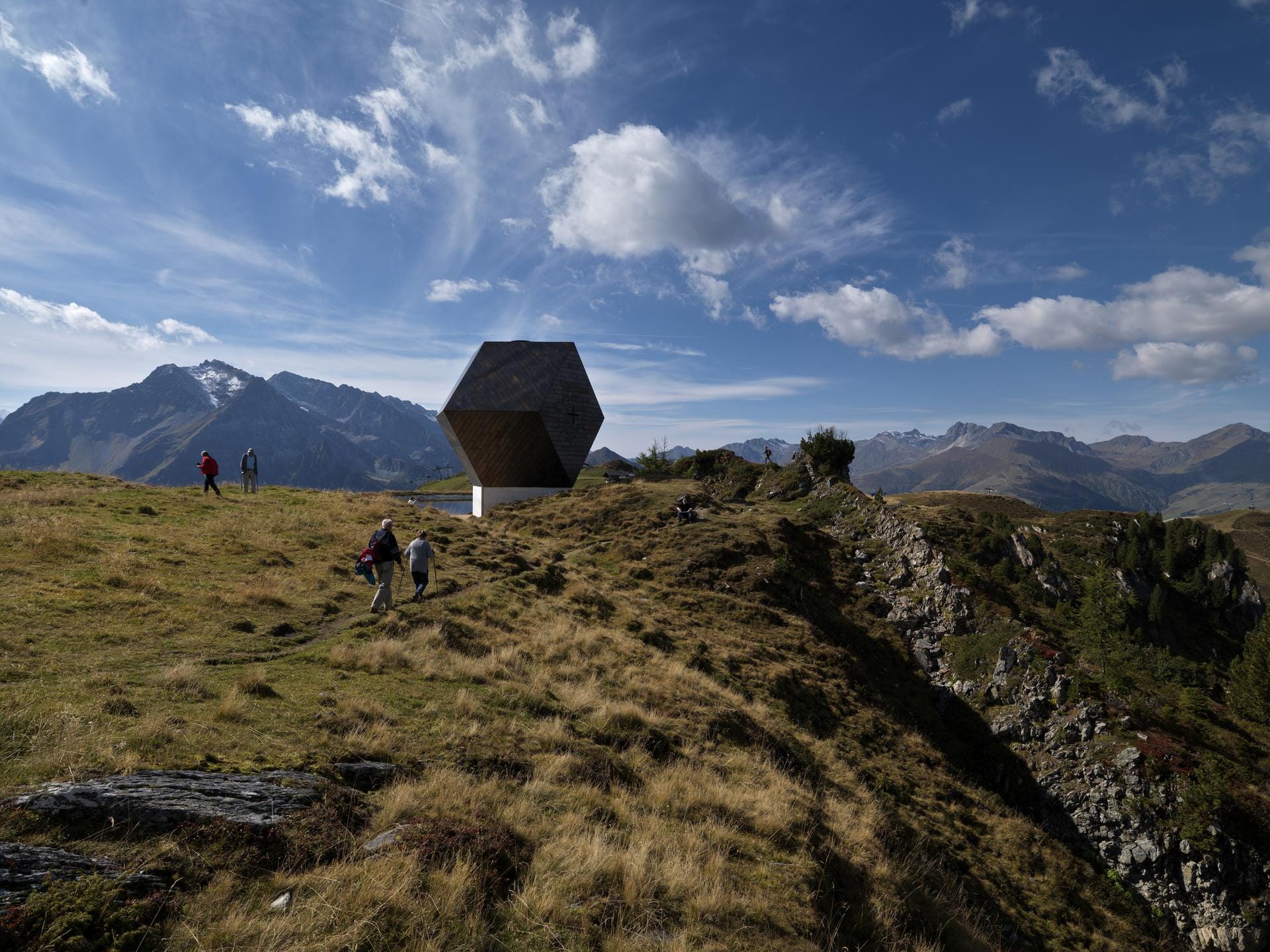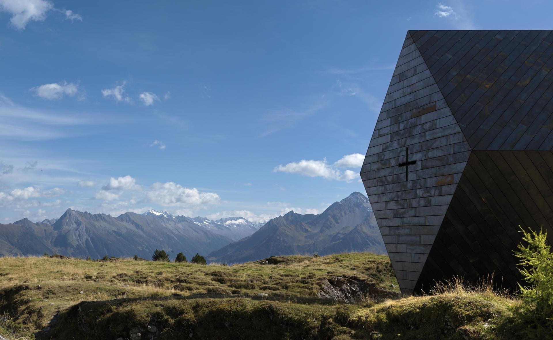 Die Idee war, die Form an die des in der Natur vorkommenden Granats anzulehnen und das zum Thema dieser Kapelle zu machen. Die Umsetzung erfolgte mit den Materialien Stahl und Holz. Die strenge und mathematisch nachvollziehbare Geometrie dieses Baukörpers sollte den strengen Kontrast zwischen der Rationalität des Menschen und der freien, organischen Natur dar - stellen. Eine solche pure Form, so ein Edelstein auf der Spitze eines Berges, ist auch die Gelegenheit, die Verbindung zwischen Himmel und Erde darzustellen. Der Baukörper ist durch die Schwerkraft mit der Erdkruste verbunden, aber ist umgeben von der Unendlichkeit des Universums und der schönen Natur des Zillertals.