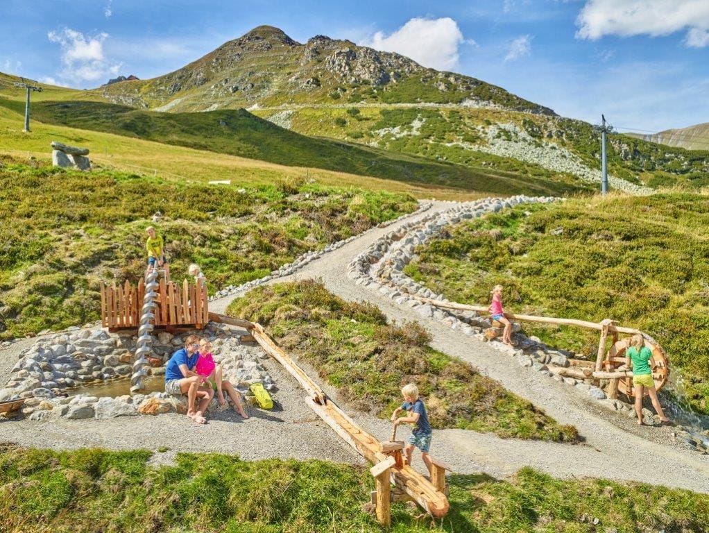 Das Zillertal mit Kindern erkunden: Die Gletscherflohsafari am Sommerberg hält verschiedenste Stationen bereit. Von Wasserspielen bis hin zu Informationstafeln wird spielerisch der Lebensraum Gletscher erkundet.