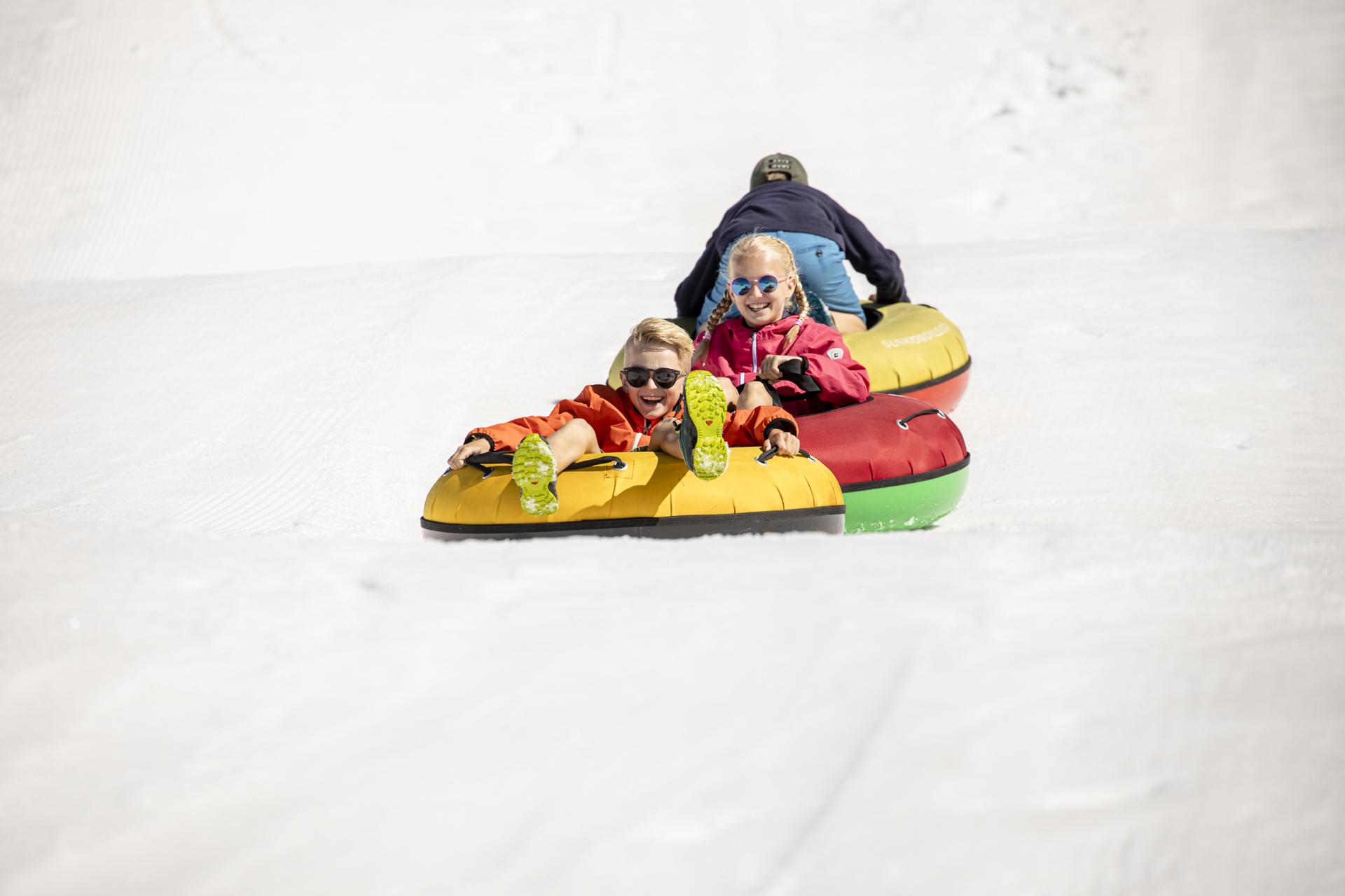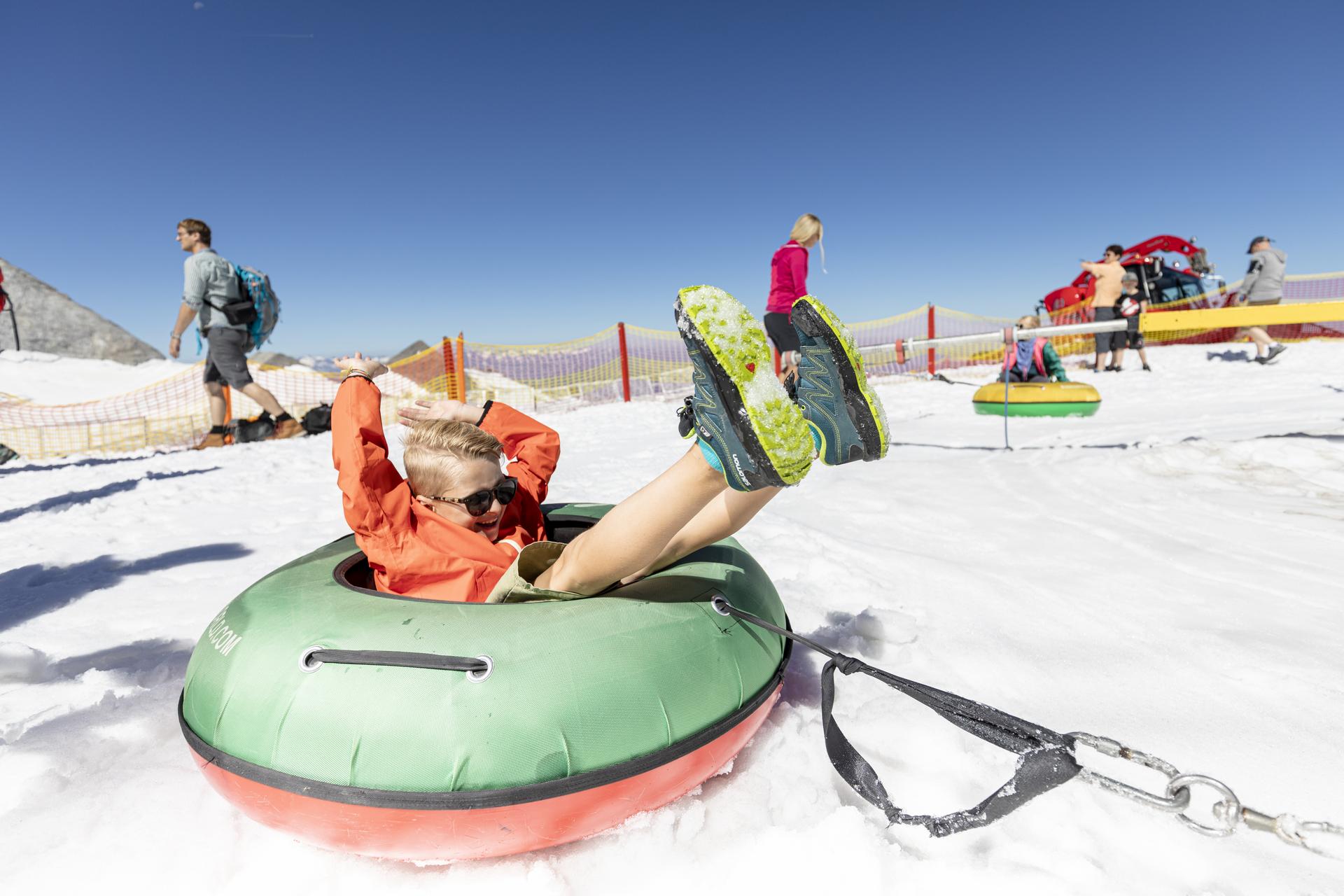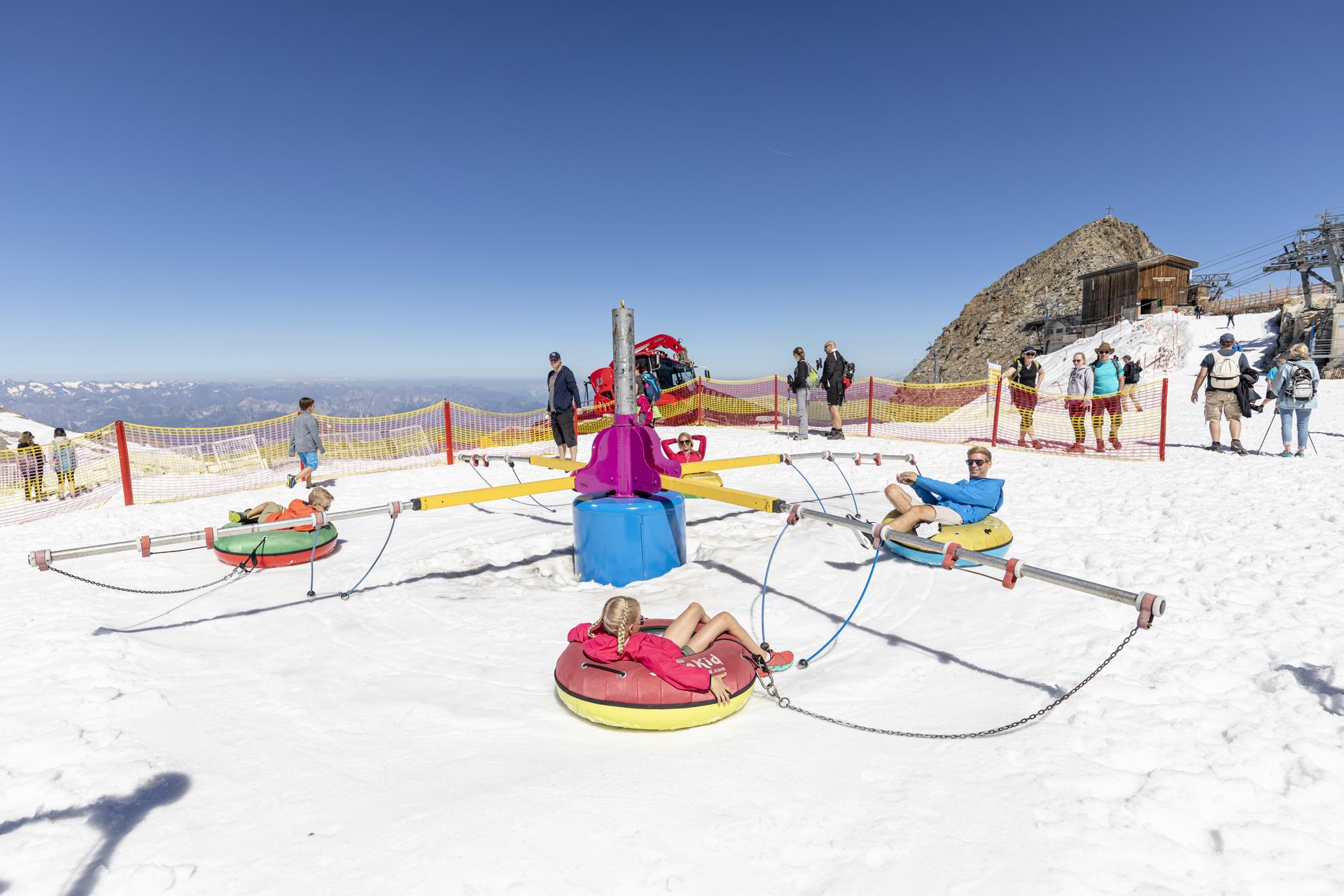 In dieser Erlebniswelt aus Schnee gehts hoch her. Erlebe Attraktionen wie Schneereifenkarussell, Tubingbahn und mehr auf 3.250 m!