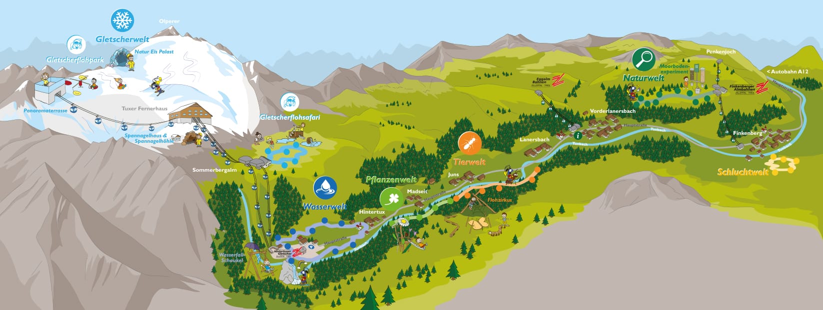 Staunen, begreifen und verstehen - Mutter Natur hat einen außergewöhnlichen und einzigartigen Lebensraum für uns alle geschaffen. Startpunkt der Naturwelt ist die Mittelstation der Finkenberger Almbahnen, von wo aus es entlang des Moorlehrpfades viele verschiedene Lebensräume zu erforschen gibt. Der spezielle Moorboden kann beim Moorbodenexperiment genauestens unter die Lupe genommen und betrachtet werden. Eine kurze Rast in den Hängesesseln oder in der Lauschinsel, wo die Geräusche der Umgebung viel intensiver und bewusster wahrgenommen werden können, versetzt Groß und Klein in tiefes Staunen. Kurz vor dem Ende der Wanderung wird die einzigartige Entspannungsinsel im märchenhaften Waldstück mit üppigem Bartflechtenbewuchs erreicht.