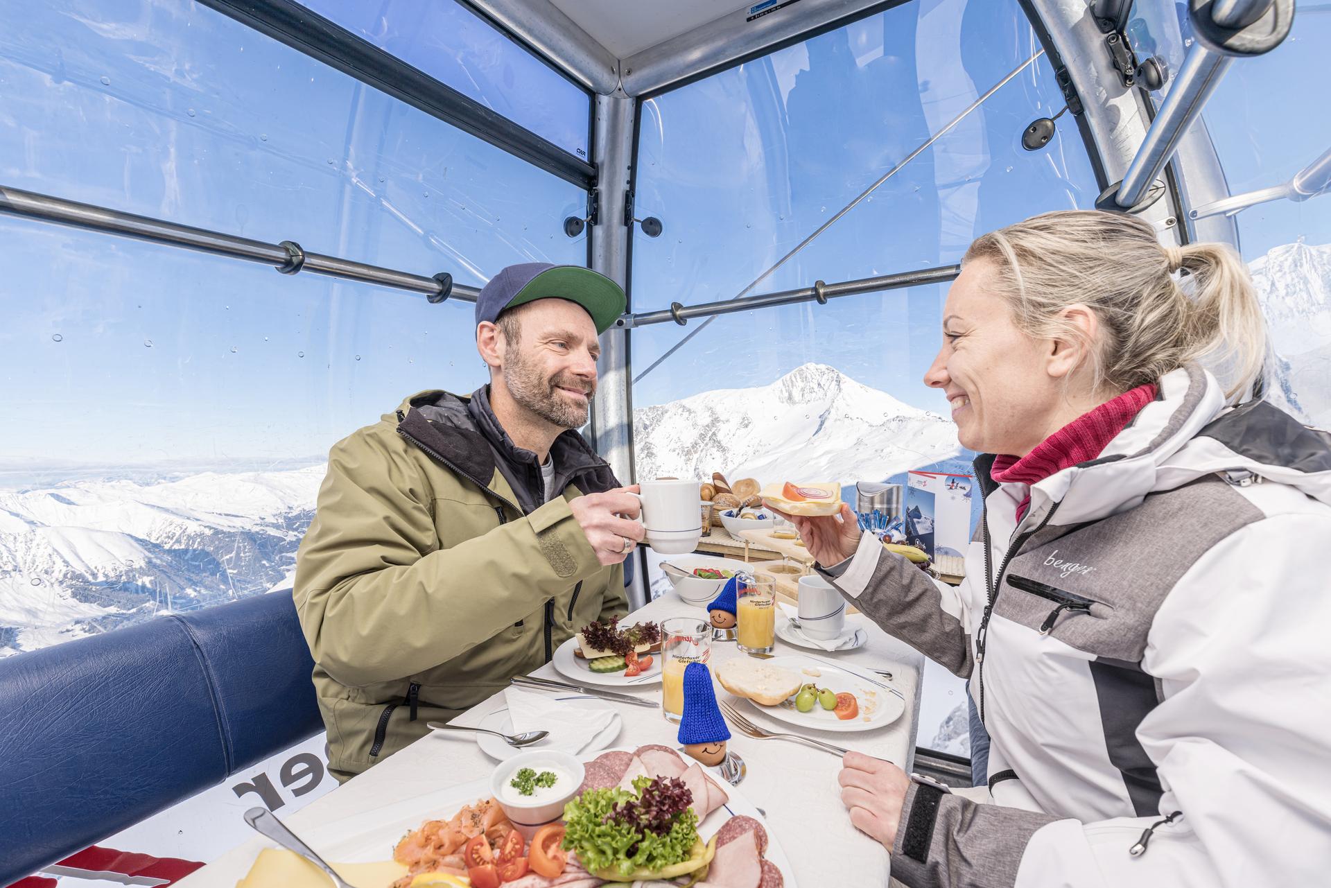 Enjoying brunch in the gondola and marveling at the breathtaking mountain panorama doesn't have to remain a dream! In the 10er Gefrorene Wand Bahn on the Hintertux Glacier, one gondola turns into an exclusive breakfast gondola every day.