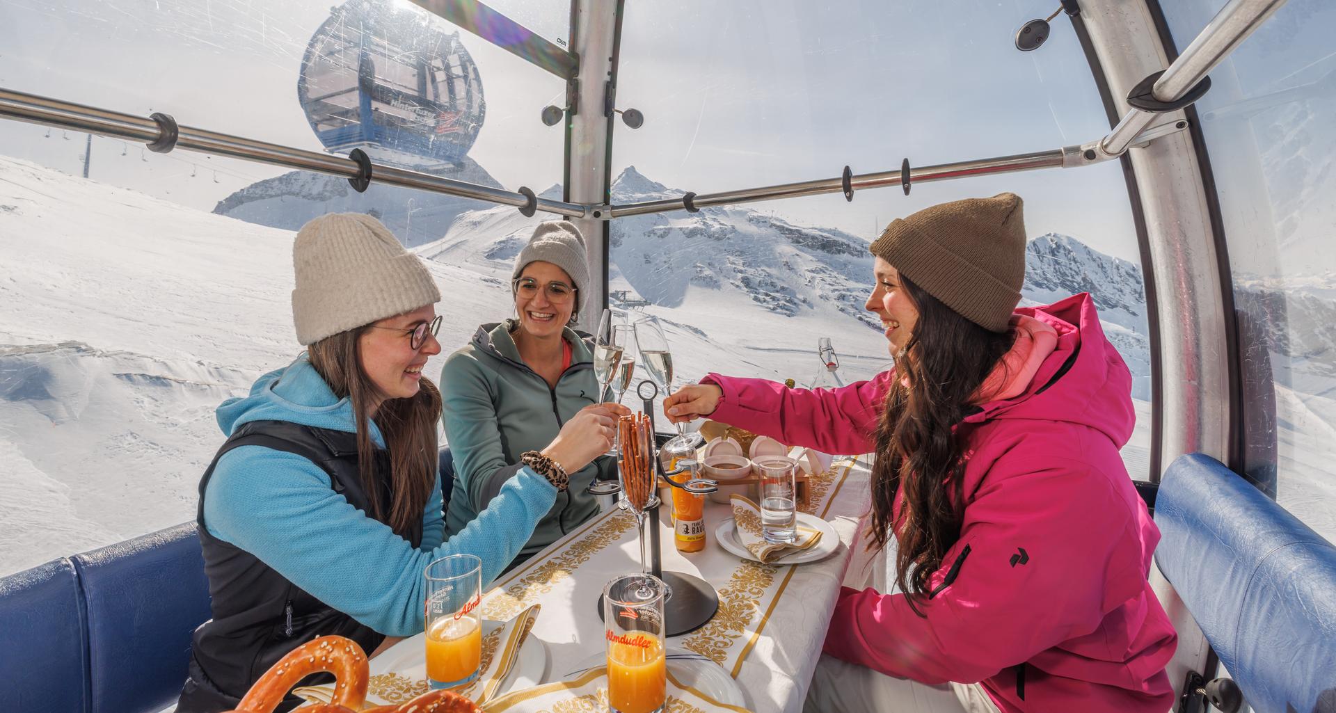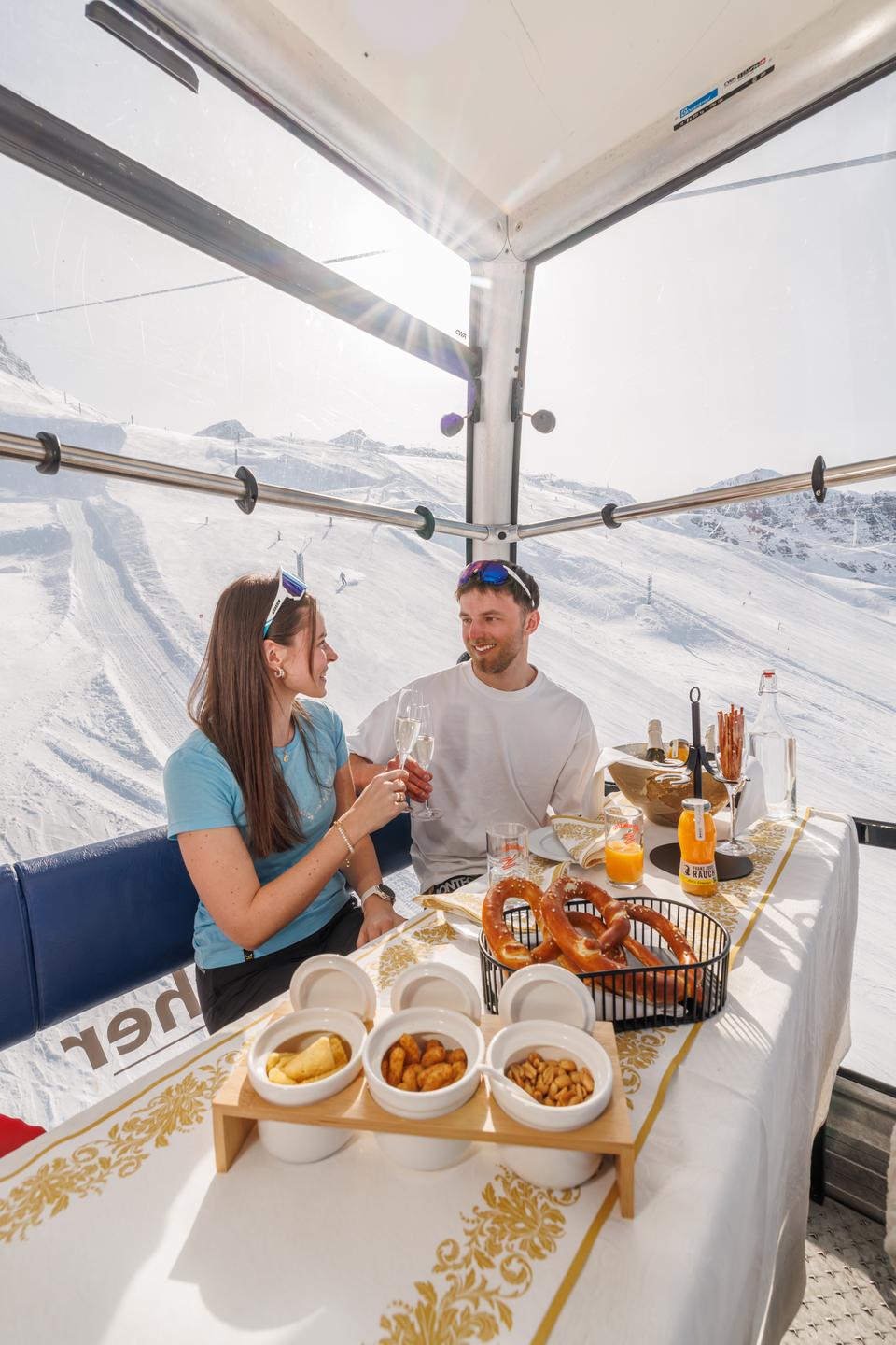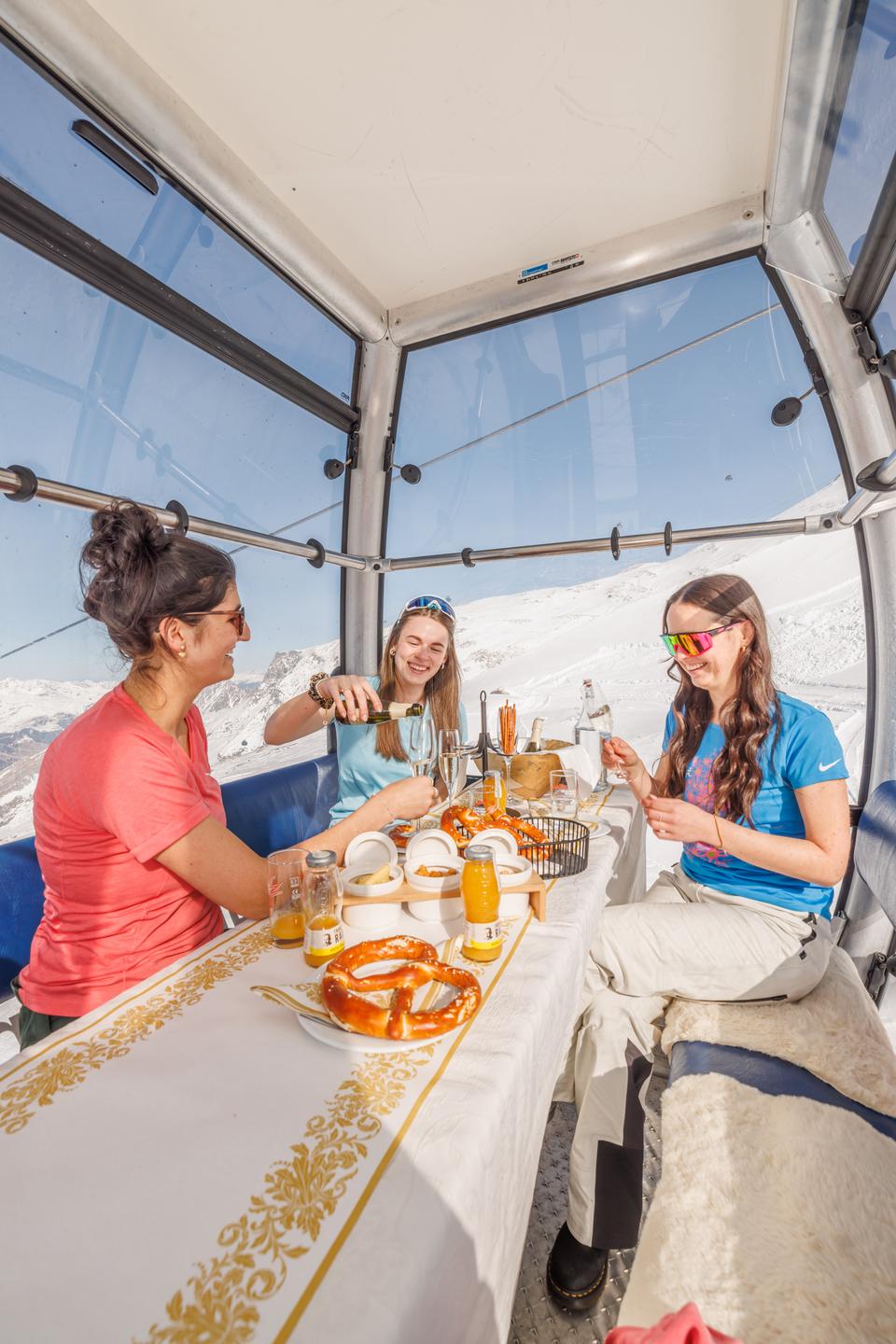You glide silently above the glittering glacier world, a glass of sparkling Secco in hand, tasty snacks – and nothing around you but pure panorama.