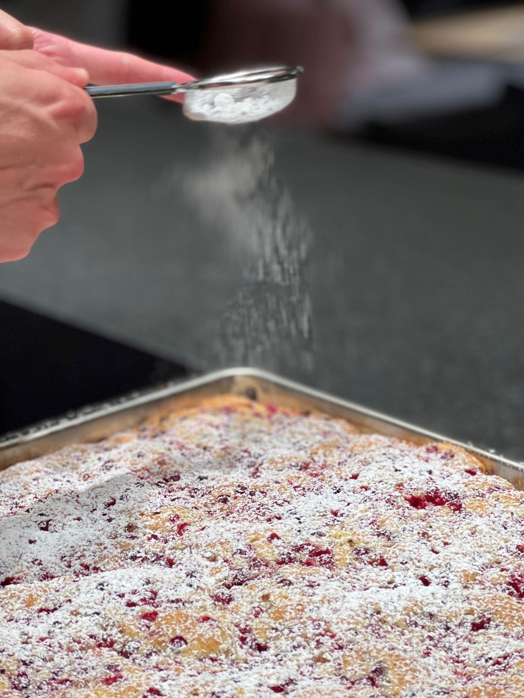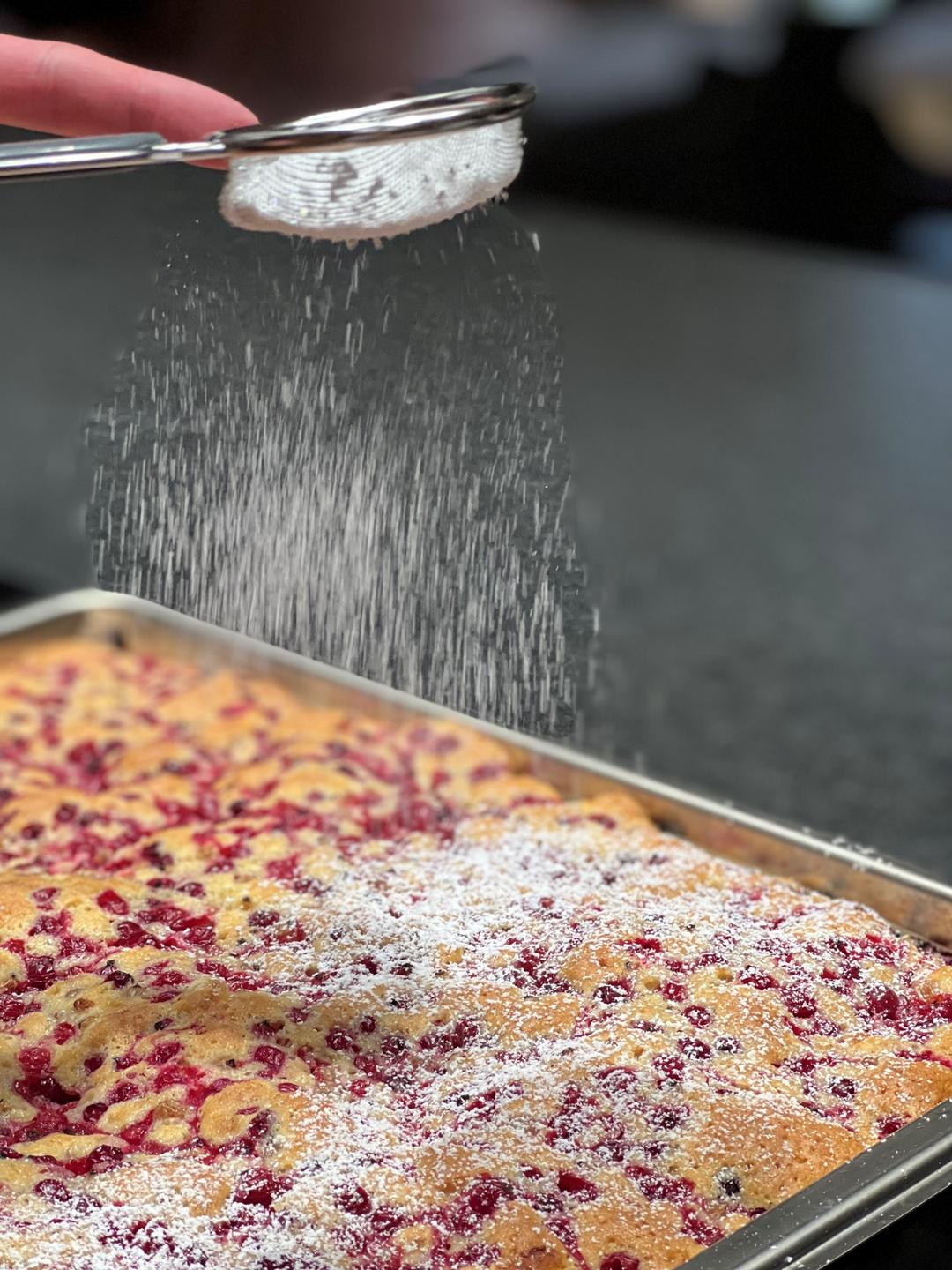 | 7. | Das Backblech mit Backpapier belegen, die Masse darauf verstreichen und mit den gewaschenen Ribisel belegen. |