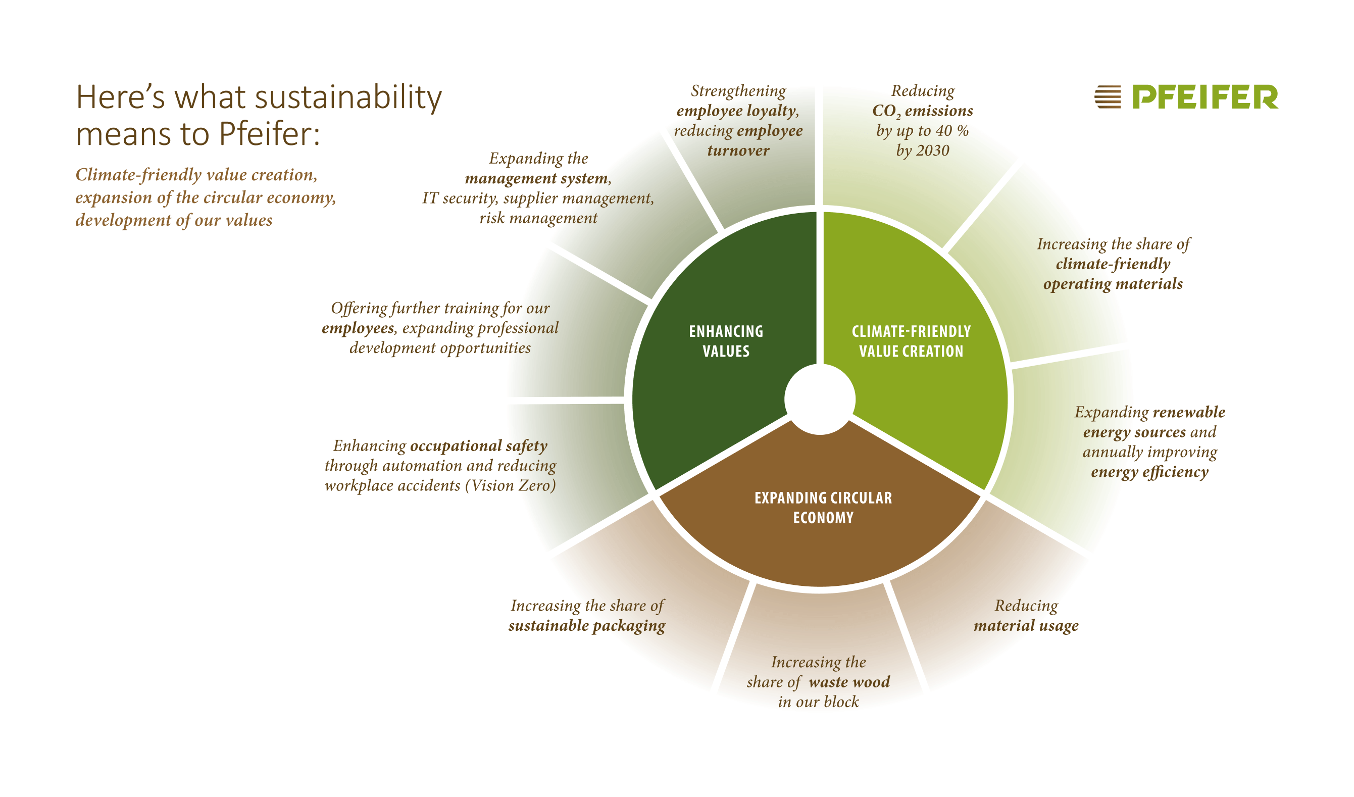 Sustainability@Pfeifer in concrete metrics and targets by 2030, with a focus on economic, environmental and social goals.
