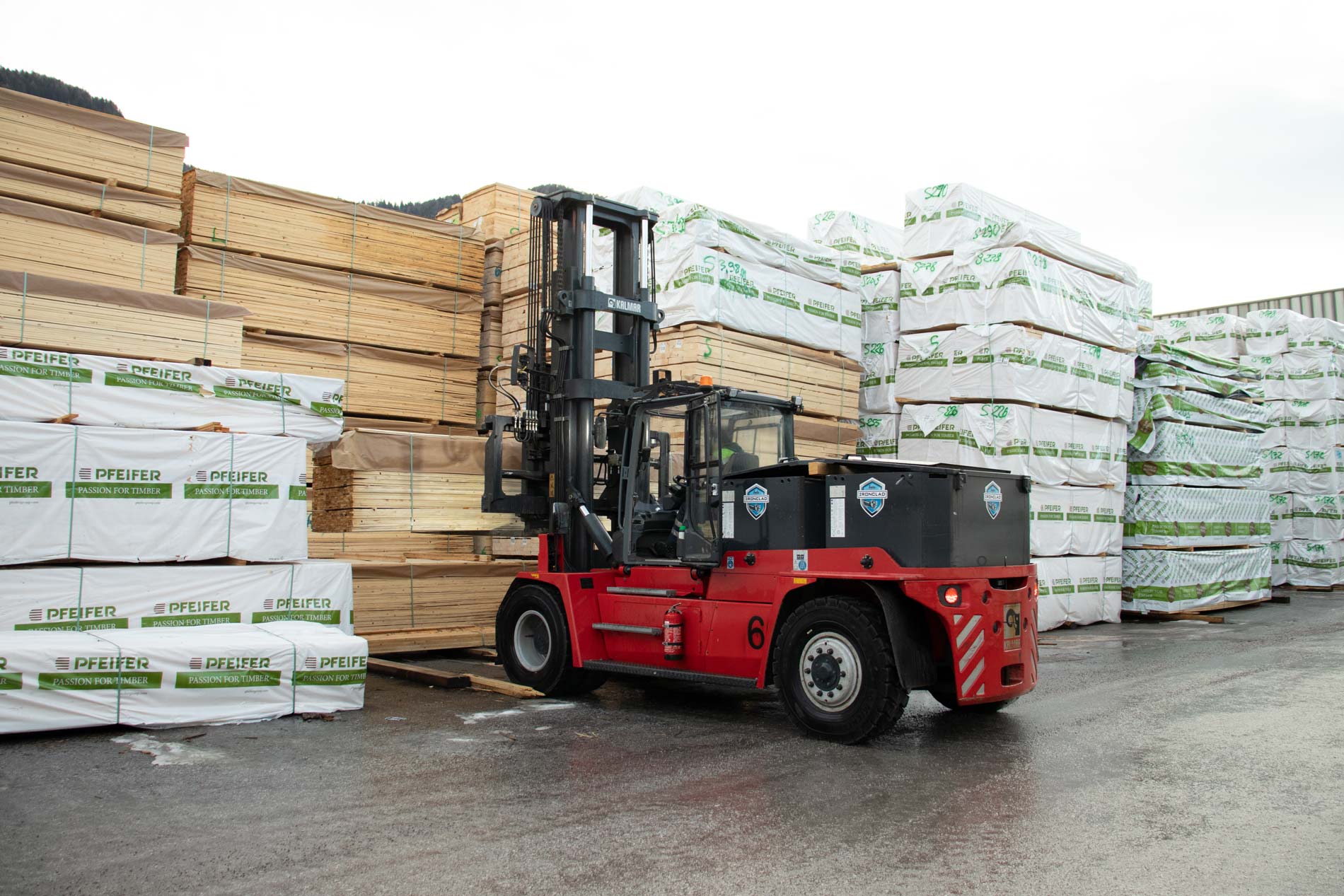 Depuis 2011/12, Pfeifer fait le pari d'un transport ferroviaire respectueux de l'environnement. Le nombre de convois ferroviaires (dans l'entrée pour la plupart), qui circulent depuis lors pour la seule entreprise autrichienne, est de 350 par an. En termes de volumes transportés, la tendance est clairement à la hausse ; de 900 000 tonnes en 2018, on est passé à des augmentations annuelles de l'ordre de 30 à 40%. La possibilité de rediriger les transports de bois rond vers les sites d'Unterbernbach, Uelzen ou Kundl en fonction des besoins fait du groupe Pfeifer le premier acteur de l'industrie du bois en termes de logistique. Le transport ferroviaire est appelé à bénéficier d'une plus forte promotion, annonce Stöckl: