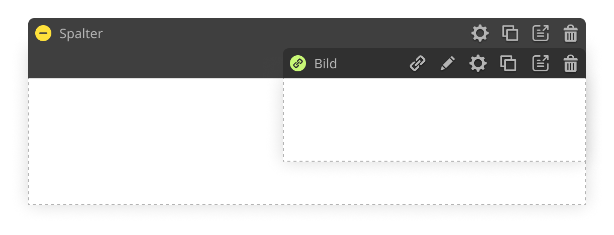 Content-Elemente können teilweise ineinander verschachtelt werden. So kann beispielsweise ein Spalten-Element benutzt werden, um Inhalte und Bilder nebeneinander anzuordnen. Typische Ansicht von zwei verschachtelten Content-Elementen: