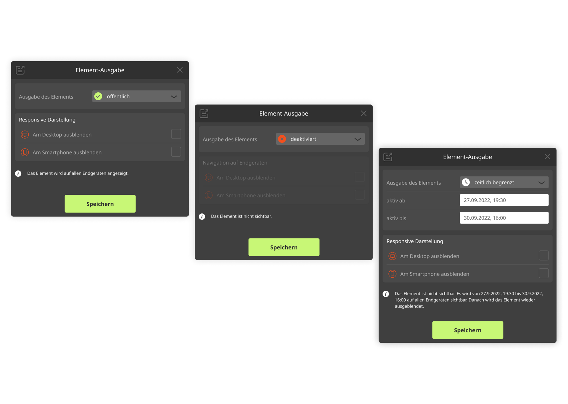 Das Sichtbarkeit eines Content-Elements über die Ausgabe-Einstellungen gesteuert werden. Deaktivierte Content-Elemente werden nicht öffentlich angezeigt. Auf diese Weise kann man Elemente für den späteren Gebrauch aufbewahren. Dies bietet sich etwa für saisonale oder noch unfertige Inhalte an. Zudem kann die Ausgabe der Content-Elemente zeitlich gesteuert werden. Dadurch lassen sich Elemente nur für einen bestimmten Zeitraum oder ab einem bestimmten Zeitpunkt einblenden/ausblenden.