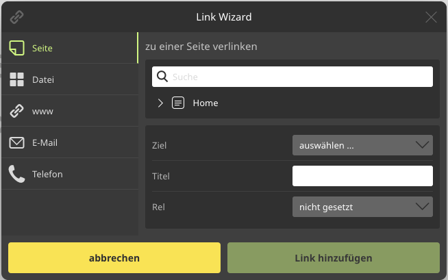 Unter "Seite" erstellst du Verweise, welche auf Unterseiten der aktuellen Domain verlinken. Der Vorteil dieser Methode ist die automatische Aktualisierung des Links durch das Bakehouse-System. Ändert sich etwa der Name einer Seite, werden alle Links, die auf diese Seite verweisen, automatisch angepasst.