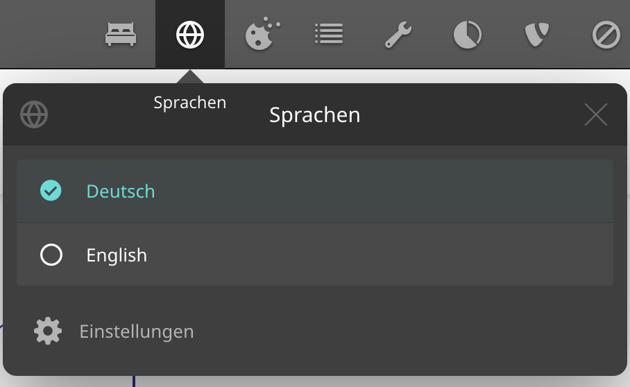 Die Sprachauswahl erfolgt über das languagesWeltkugel-Symbol in der Leiste der Bakehouse-Apps. Das Symbol scheint nur auf, wenn das Sprachmodul erworben wurde.