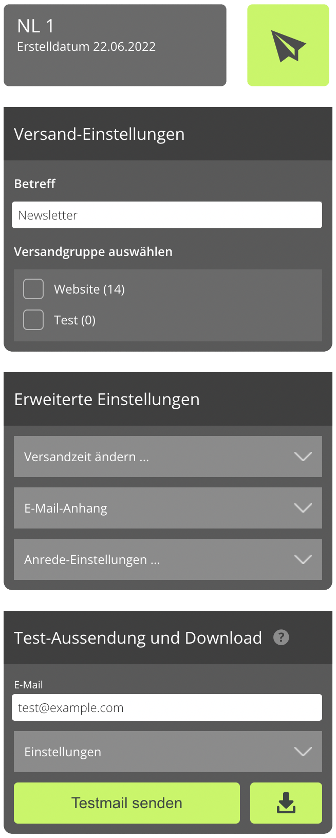 Um den aktuellen Newsletter vor dem Versand an alle Empfänger zu testen, kann eine Testmail versendet werden.