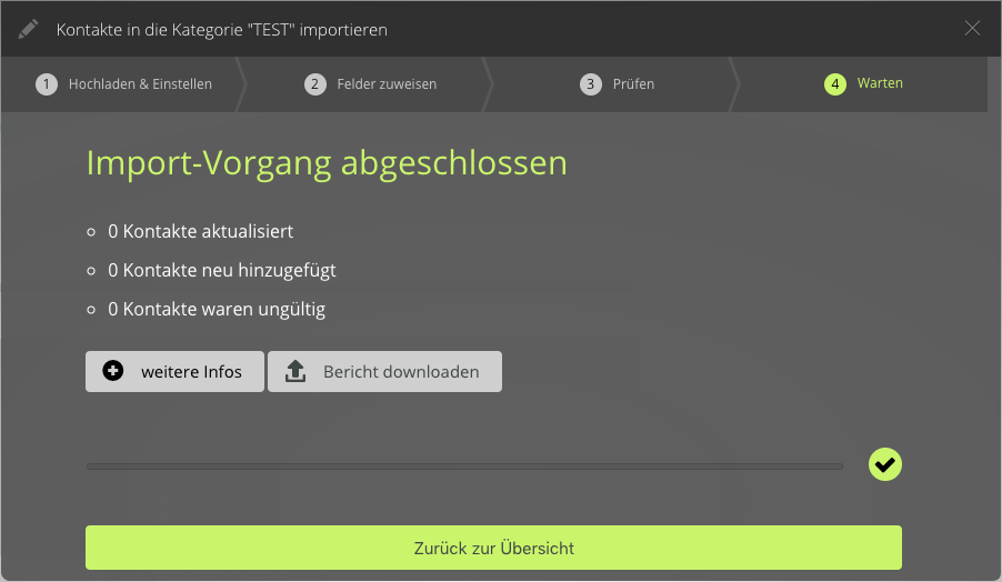 - Bericht: Nach dem Import wird eine Zusammenfassung angezeigt, die auch als TXT-Datei heruntergeladen werden kann.