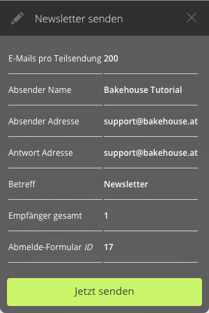 Im Kontrollfenster werden alle für den Versand des Newsletters spezifischen Daten ausgegeben. Mit einem Klick auf "Jetzt senden" wird der Newsletter an den Mailserver übergeben und abgearbeitet.