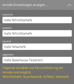 Das Newslettersystem des Bakehouse kann auf Wunsch bestimmte Textblöcke pro Empfänger individuell ausgeben. So kann zum Beispiel eine direkte Anrede erreicht werden (Sehr geehrte Frau Maximilia Musterfrau).