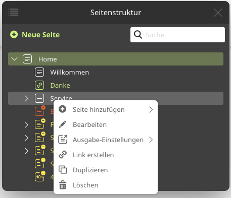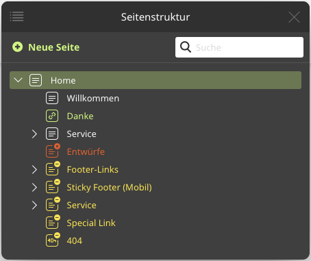Neben dem Seitennamen wird der Status in Form von Icons angezeigt. Bei mehreren zutreffenden Zuständen, werden die Icons je nach Wichtigkeit überlagert angezeigt.