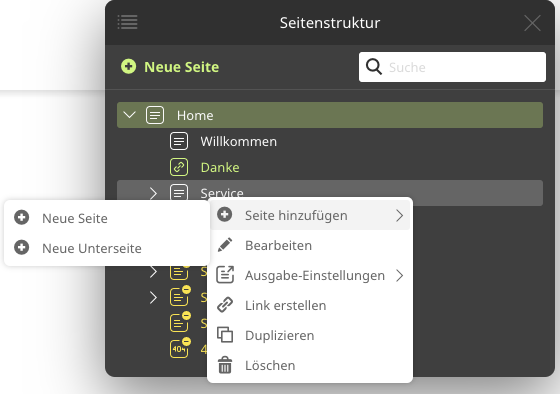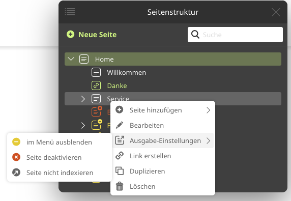 Die Ausgabe einer Unterseite kann direkt im Kontext-Menü geändert werden.