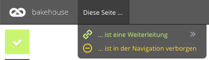 Neben dem Hervorheben in der Seitenstruktur, wird zusätzlich in der linken Ecke des Bakehouse-Interface der Status der aktuellen Seite angezeigt. Bei einer Weiterleitung kann man über diese Anzeige die verlinkte Quelle aufrufen.