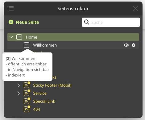 Im Tooltip wird auch der Status der Seite bezüglich Erreichbarkeit, Sichtbarkeit in der Navigation und Indexierung angezeigt.