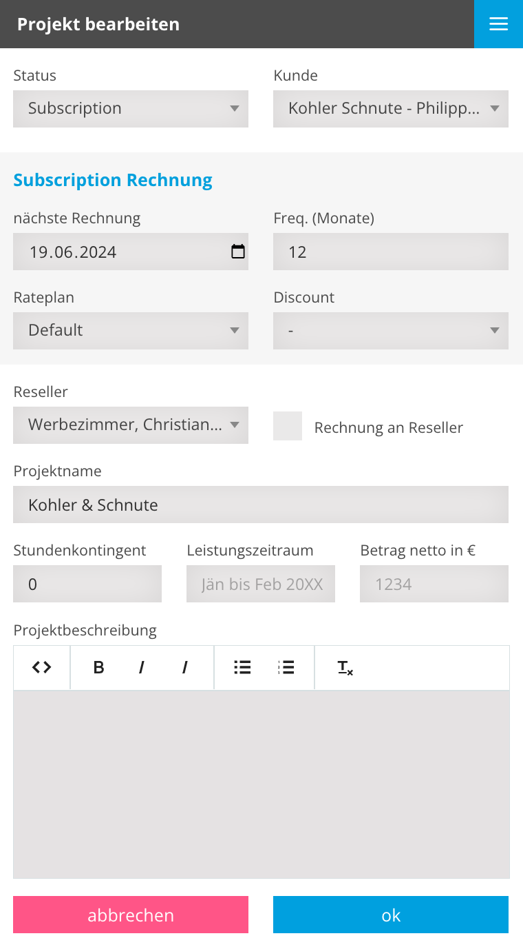 Bei diesen Projekten muss Rechnung an Reseller gecheckt sein.