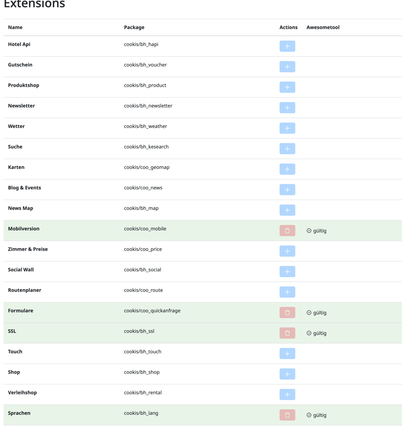 Detailansicht des Projektes öffnen und die notwendigen Extensions installieren. Die Spalte ganz rechts zeigt an, ob im Awesometool eine korrekte Subscription aus Schritt 3 vorliegt.