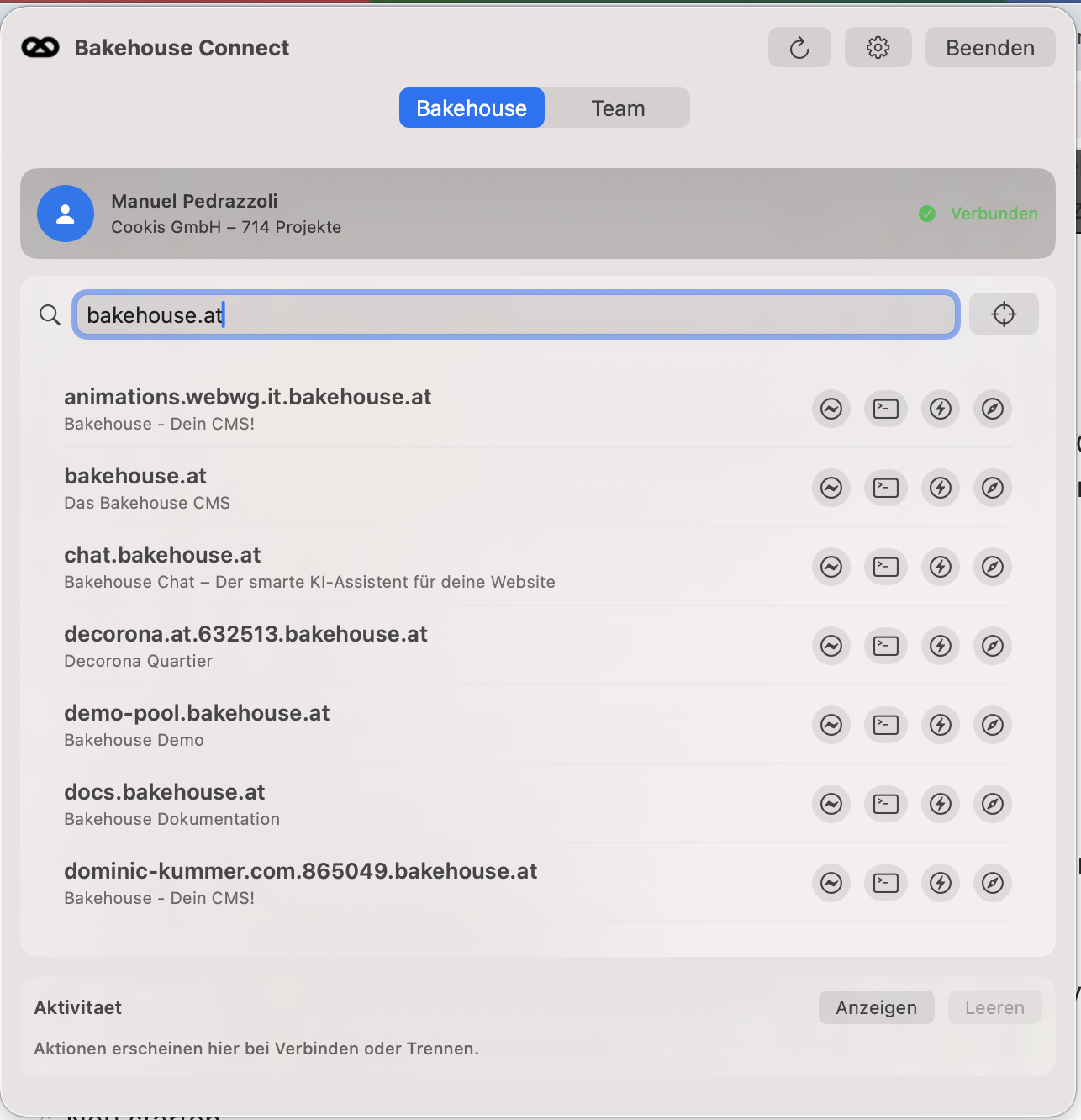 Bakehouse-Connect ist eine Mac-only App die das Bakehouses für einen Reseller anzeigt und das Verbinden mit VS-Code erlaubt und zusätzliche Features wie zB Cache-Löschen zur Verfügung stellt.