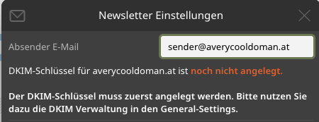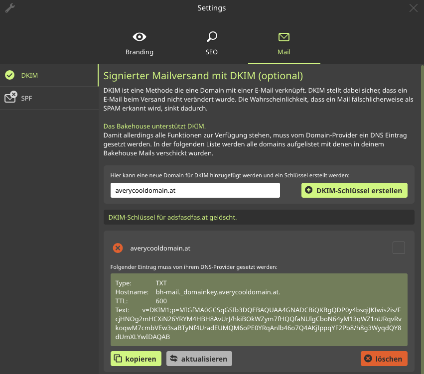 - Wenn noch kein DKIM-Schlüssel hinterlegt ist, diesen über die General-Settings des Bakehouses einen DKIM-Schlüssel für die Domain erstellen.
