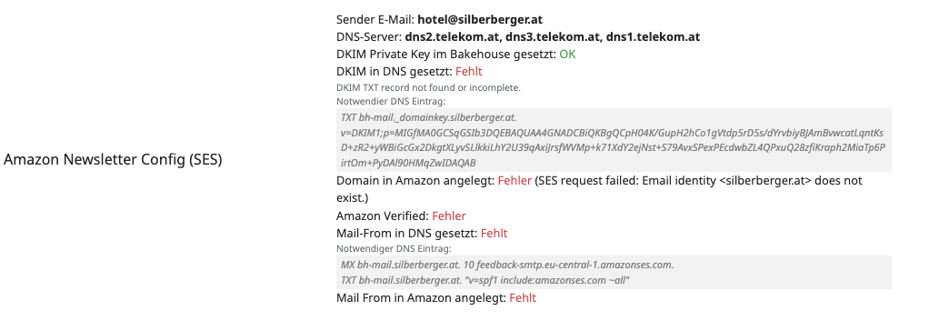 - Wenn die DNS Einstellungen eingetragen sind, dann erscheinen im cms.bakehouse.at zwei blaue Buttons um Amazon-Settings und Mail-From zu aktivieren. Diese anklicken. Nach wenigen Minuten sollte alles korrekt als grün angezeigt werden.