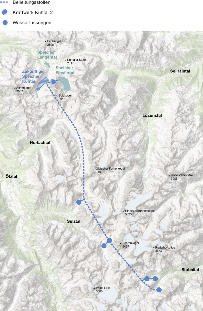 Mit zusätzlichem Wasser aus dem mittleren Ötztal und hintersten Stubaital wird die Erzeugung von Strom aus natürlichem Zufluss in der erweiterten Kraftwerksgruppe erheblich gesteigert. Darüber hinaus verbessert sich auch der Gesamtwirkungsgrad der bestehenden Kraftwerksgruppe.