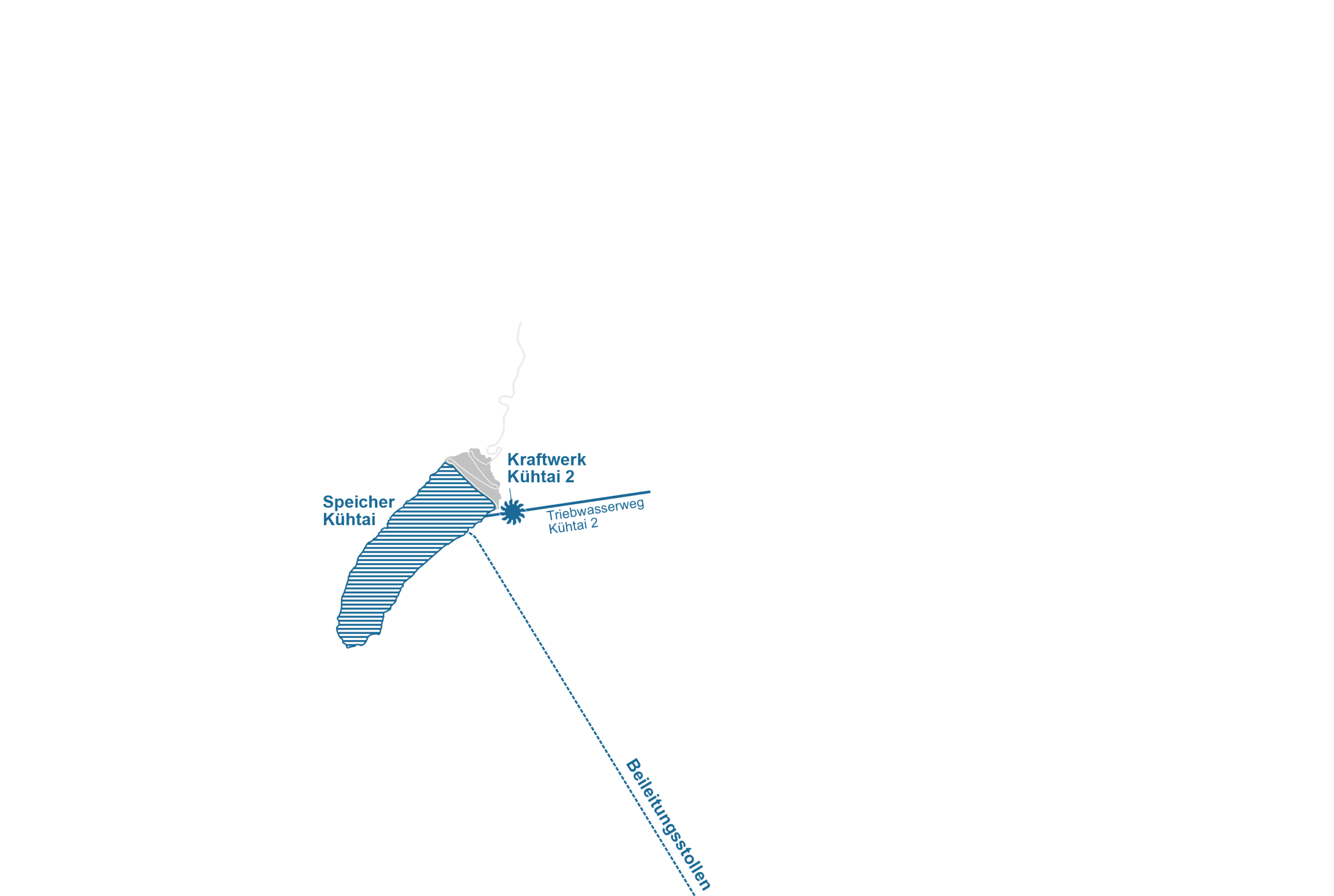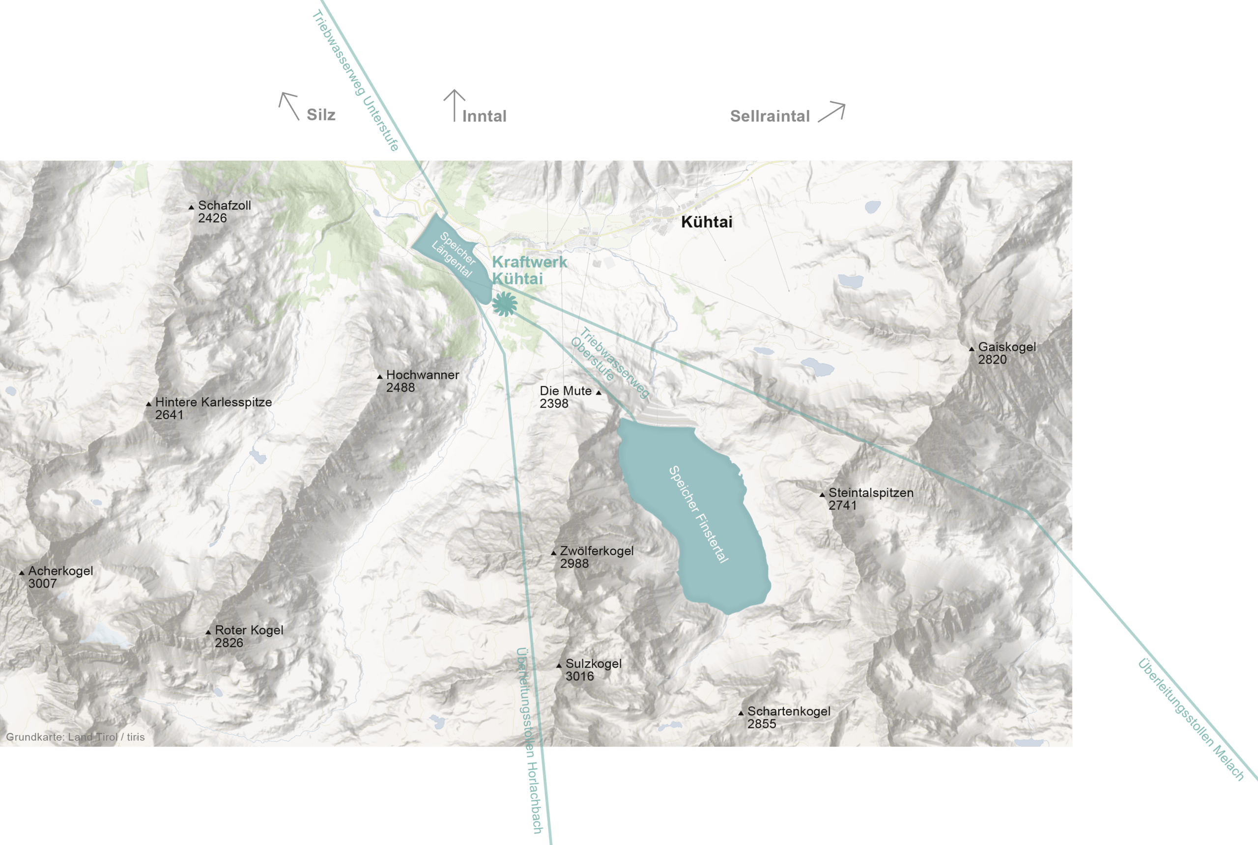 So kann das Wasser zur späteren Stromerzeugung gespeichert werden – wie bei einem Akku, jedoch in viel größeren Mengen. Die Zu- und Ableitung der elektrischen Energie erfolgt über eine kurze, erdverlegte 220 kV-Kabelverbindung zum bestehenden Kraftwerk Kühtai, das ja bereits an das Stromnetz angeschlossen ist. Eine neue Hochspannungsleitung ins Inntal ist nicht erforderlich. Dies ist nur einer von vielen Standortvorteilen aufgrund der bestehenden Kraftwerksanlagen und Infrastruktur.