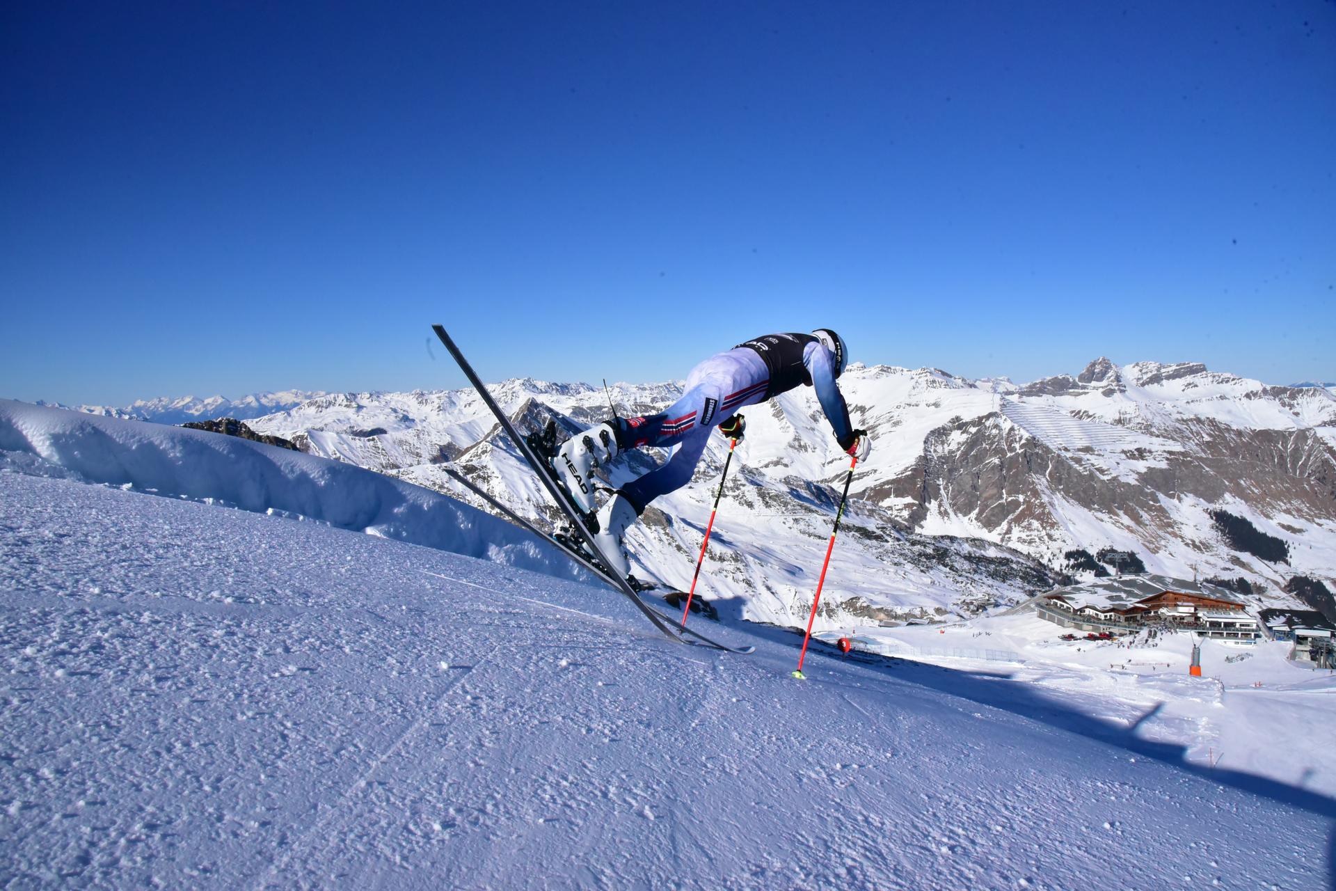 Ski racer pushing off for a downhill run in front of a snow-covered mountain backdrop