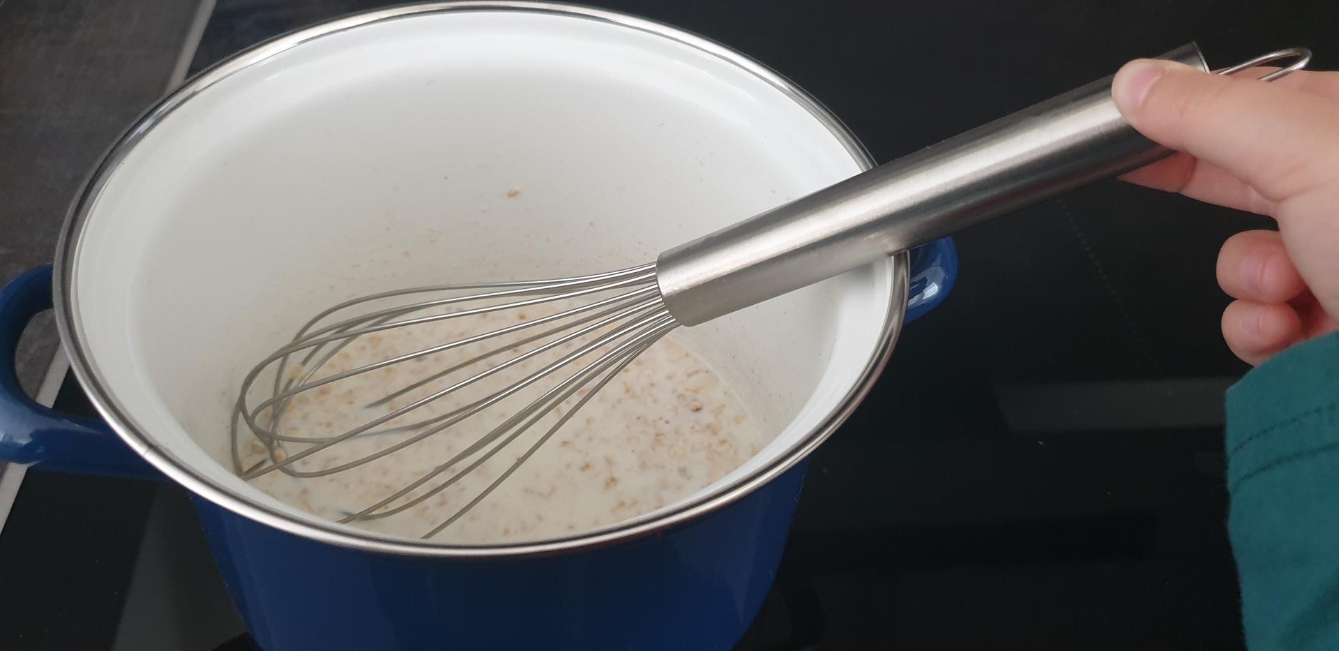 Gieß die Milch in den Topf und lass sie aufkochen. Wenn die Milch kocht, nimmst du den Topf vom Herd und mischst die Haferflocken unter.
