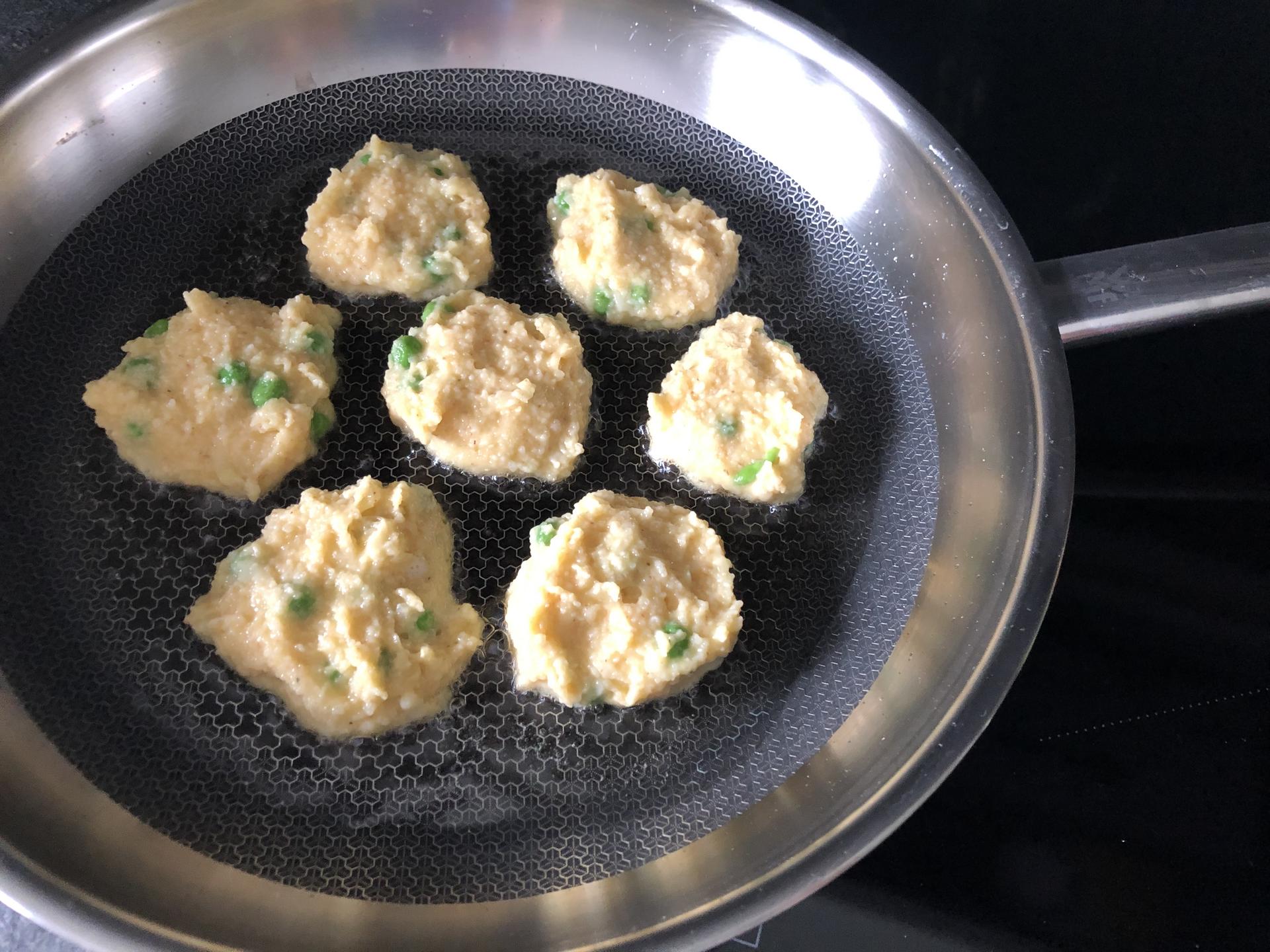 - Gib das Öl in eine Pfanne und erhitze es auf der höchsten Stufe. Stich mit dem Löffel aus der weichen Masse Häufchen aus und setz diese mithilfe eines zweiten Löffels in die Pfanne.