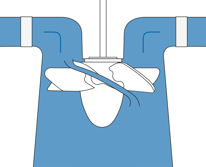 Das aus den Bechern ausströmende Wasser gelangt mit sehr geringer Geschwindigkeit in freiem Fall bzw. entlang der Wände des Turbinengehäuses in das Unterwasser. Die Pelton-Turbine findet bei großen Fallhöhen und relativ geringen Durchflüssen ihren Einsatz.