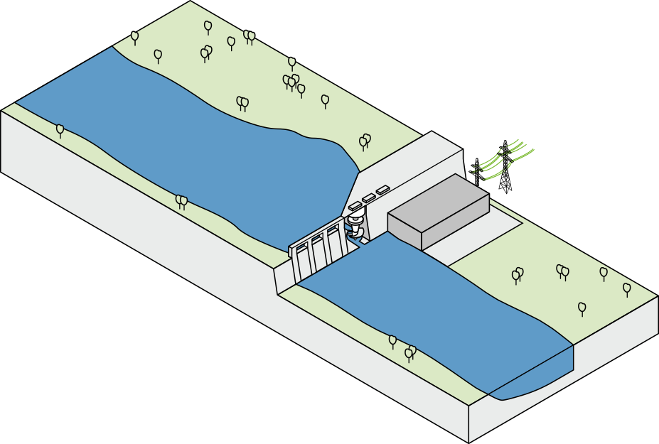 Laufkraftwerke produzieren entsprechend der Wasserführung in Bächen und Flüssen kontinuierlich Strom, denn der Wasserzufluss treibt die Turbinen ständig an. Laufkraftwerke sind daher rund um die Uhr in Betrieb und erzeugen so den Grundbedarf an Strom. Manche Anlagen verfügen auch über kleinere Stauseen die es erlauben, einen Teil des Stroms passend zum schwankenden Bedarf zu produzieren. In Laufkraftwerken werden je nach zur Verfügung stehender Fallhöhe und Durchfluss Peltonturbinen, Francisturbinen, Kaplan-Turbinen zum Einsatz gebracht. Aufgrund der oft geringen Fallhöhe und großen Wassermengen in Flusskraftwerken, wie am Bild links dargestellt, werden dort meist Kaplan-Turbinen bzw. Kaplan-Rohr-Turbinen verwendet.