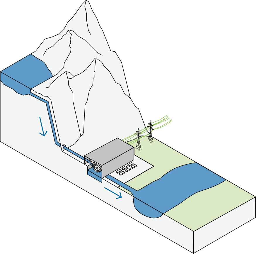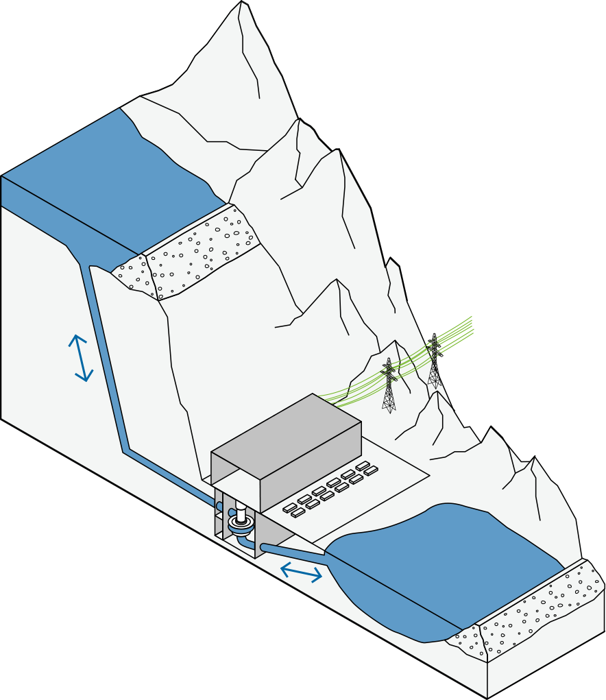 Speicherkraftwerke passen sich bei ihrer Stromproduktion an den Bedarf an. Dabei wird Wasser in großen Stauseen gespeichert – so kann auch im Winter bei geringer Wasserführung Strom erzeugt werden.
