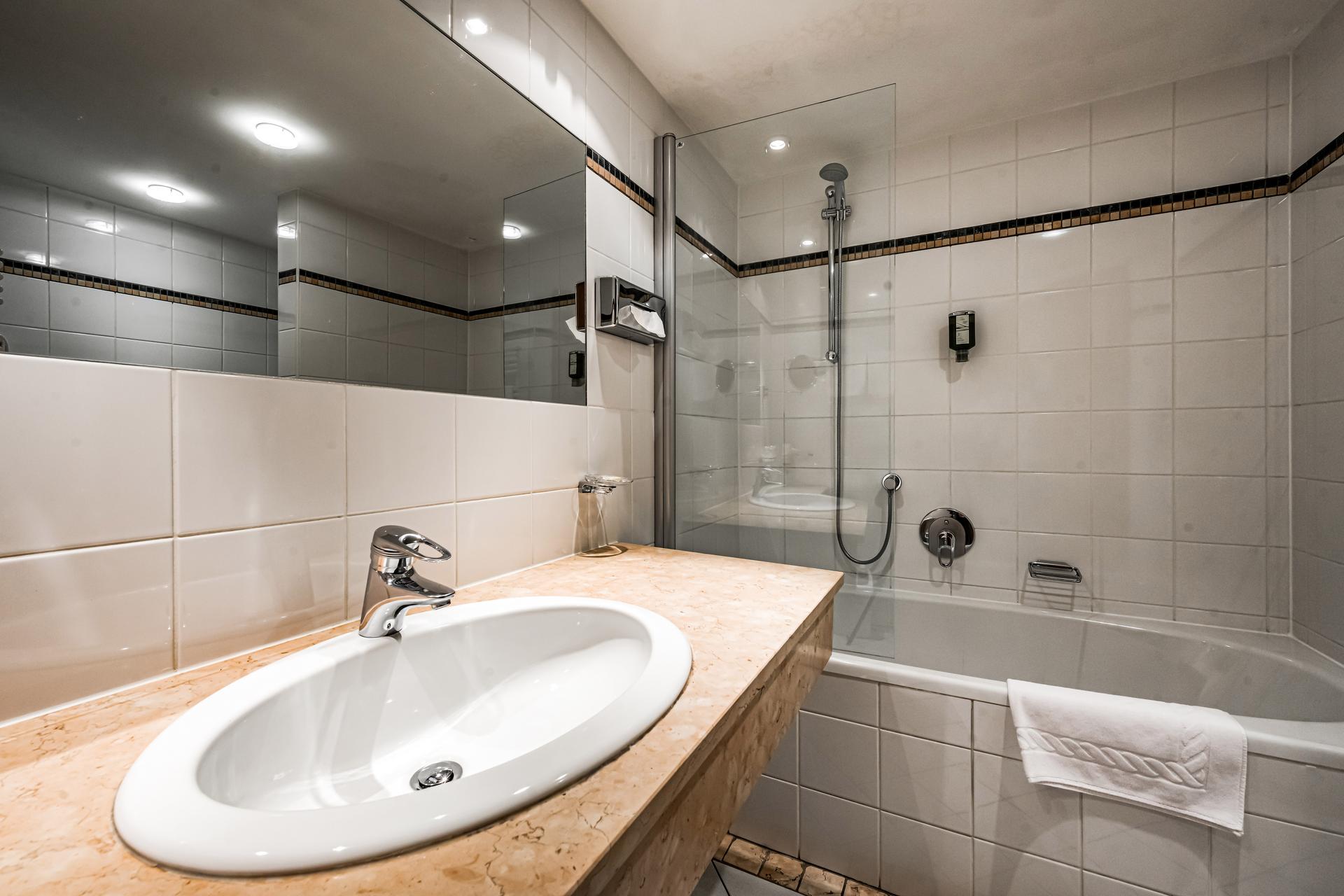 Das Badezimmer verfügt über eine Dusche oder eine Badewanne und ein WC. Inklusive kostenloser Pflegeprodukte, Bademantel und Haartrockner.