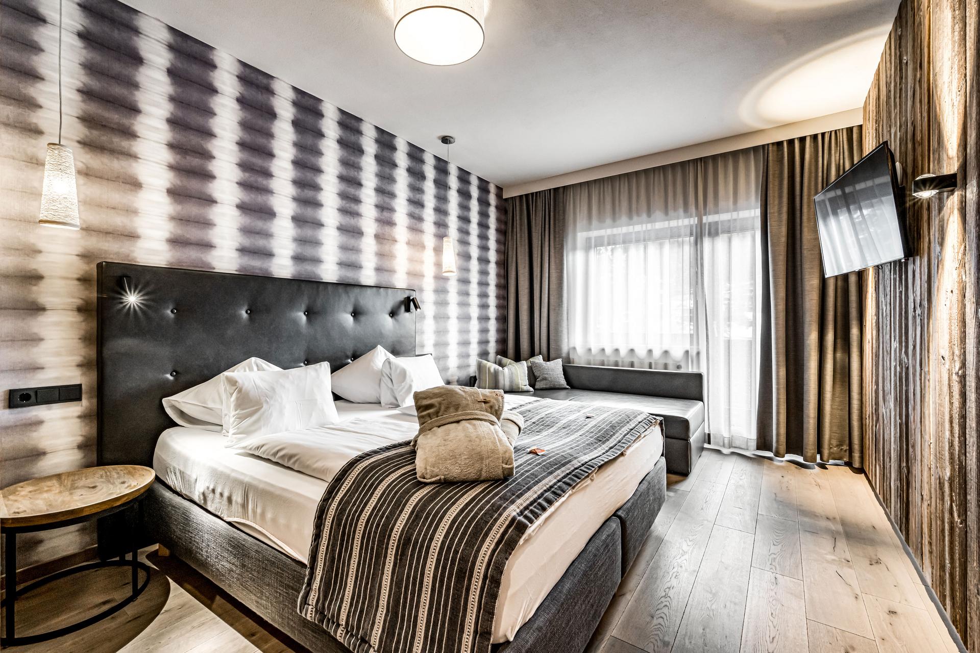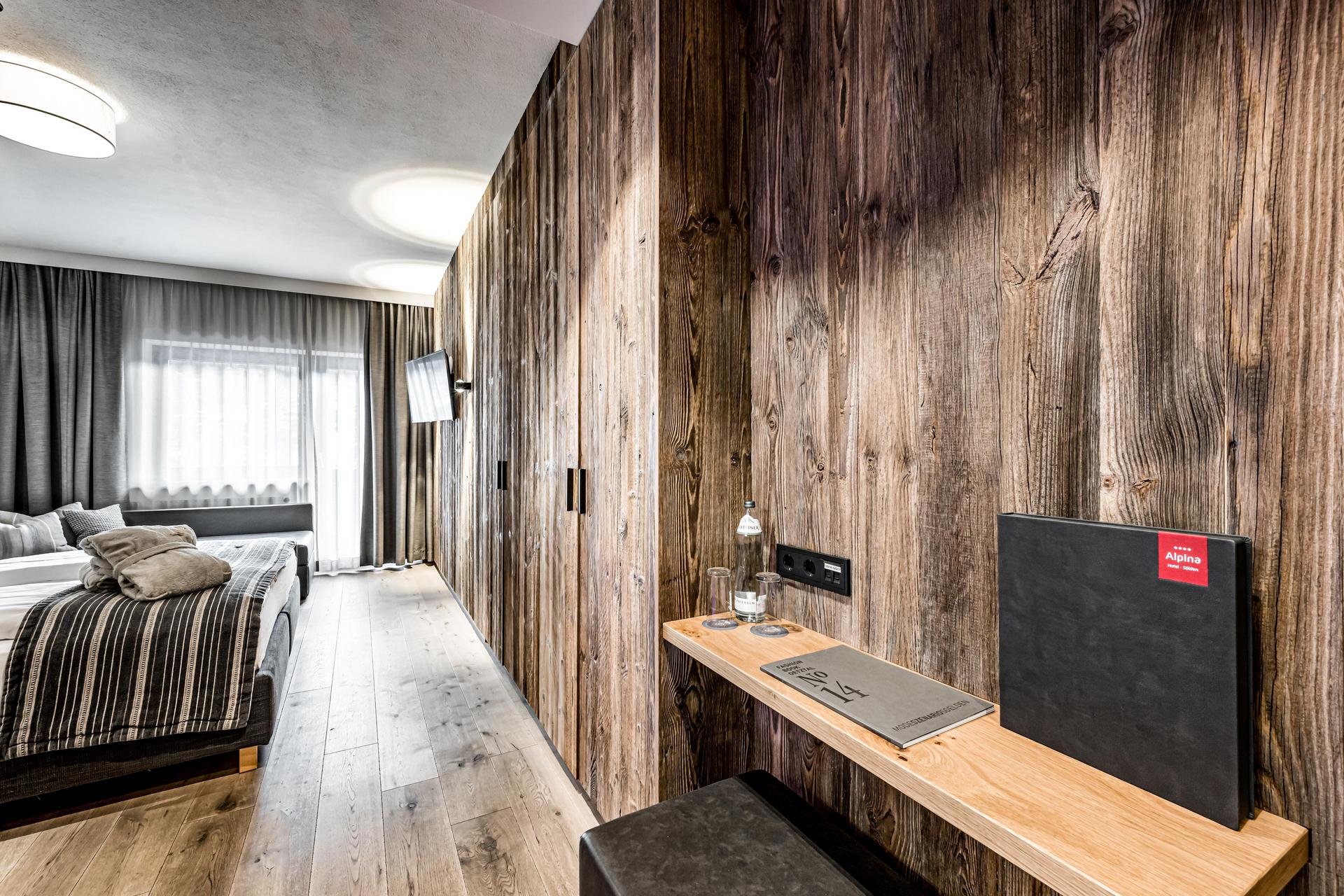 Im Doppelzimmer Ötztal warten heimelige Behaglichkeit und modernes Design auf dich. Wertvolles Fichten-Altholz und hochwertige Eichenholzböden kreieren ein wohltuendes Ambiente. Das Zimmer verfügt über ein Telefon, Radio, Kabel-TV, einen Safe und Balkon. Eine Schlafcouch bietet Platz für eine weitere Person.